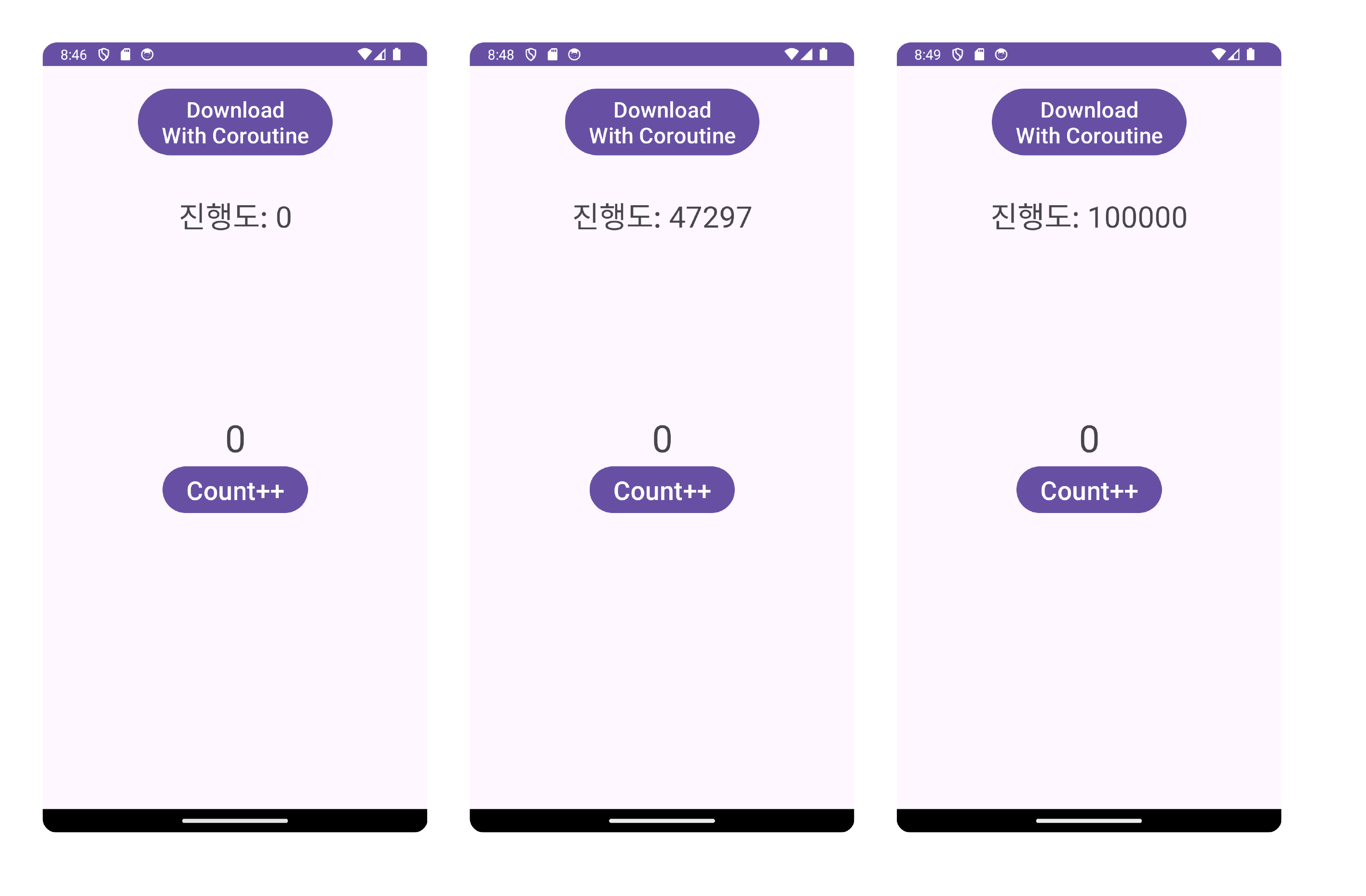 downloadData() 함수에 #1에서 에러가 났었던 코드 tvProgress.text = "진행도: $i"를 넣고 withContext(Dispatchers.Main) { ... }로 감싼다. withContext()는 코루틴의 실행 스레드를 변경하는 함수다. withContext()는 Suspending Function이고, Suspending Function은 Suspend Function에서만 호출할 수 있으므로, downloadData()에 suspend 키워드를 붙여준다.