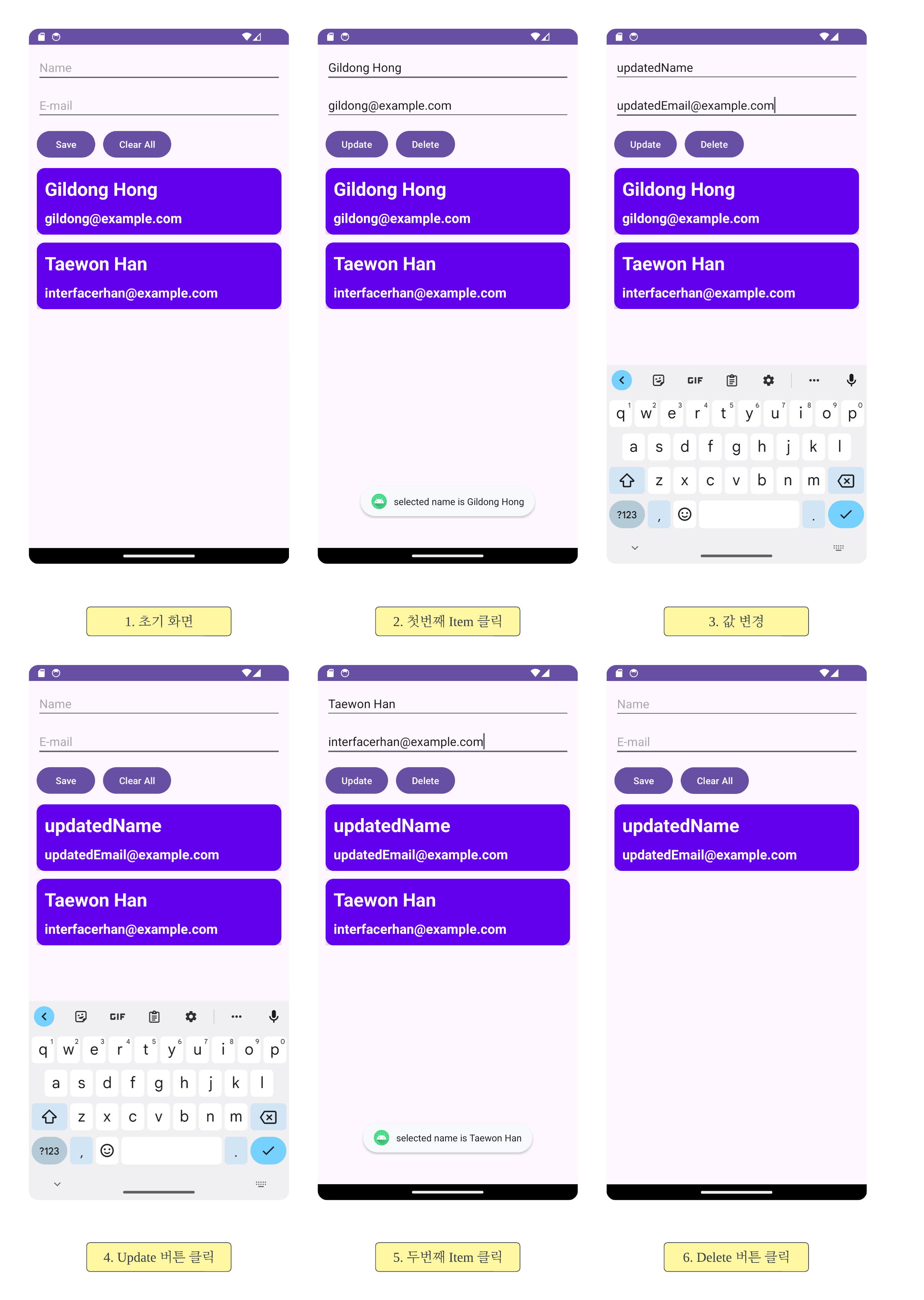 RecyclerView의 Item이 잘 뜨는 모습이다. 각 Item을 클릭하면 버튼이 바뀌며, Update 및 Delete 동작도 잘 수행된다.