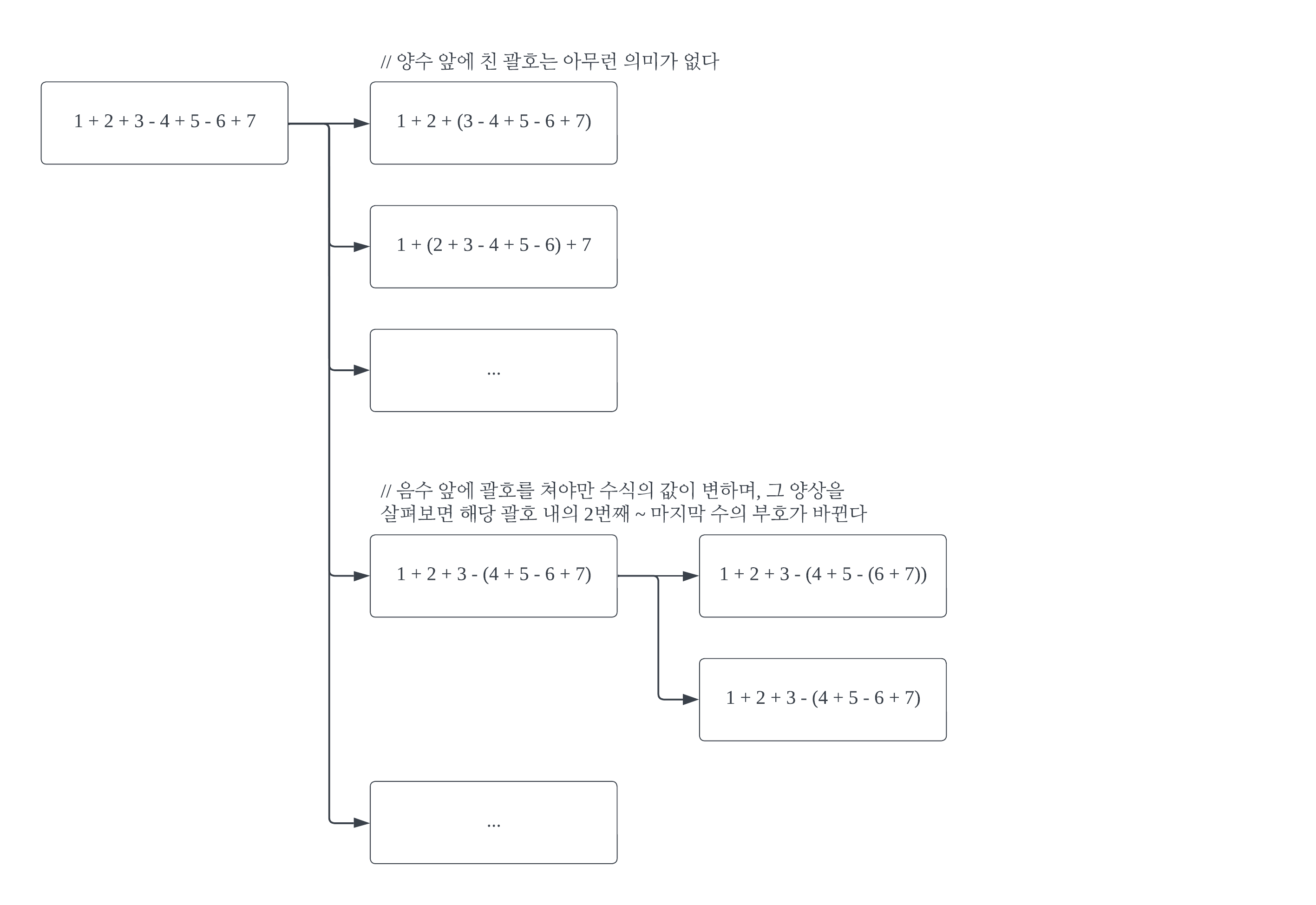 괄호의 영향으로 각 수의 부호를 바꾸는 작업을, #2의 코드에서 braketize()라는 함수로 구현했다.