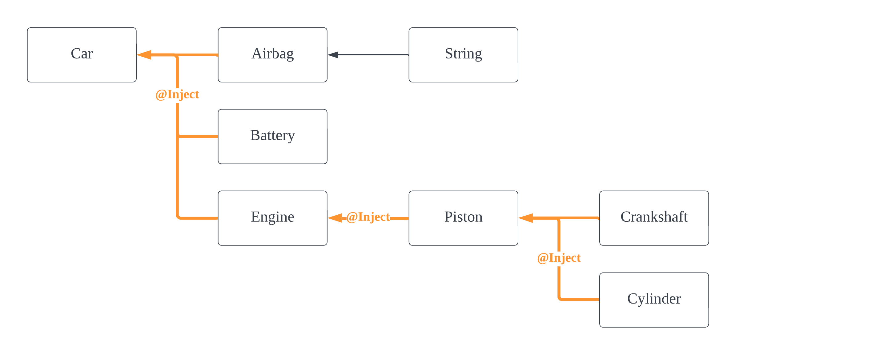 #1 ์ด์ ๊ธ ์์กด์ฑ ์ฃผ์ (Dependency Injection)#1 ์์กด์ฑ ์ฃผ์ (Dependency Injection)์ด๋?#1-1 Dependent์ Dependencyfun main() { val car = Car() car.startCar() } class Car { private val engine = Engine() private val airbag = Airbag() private