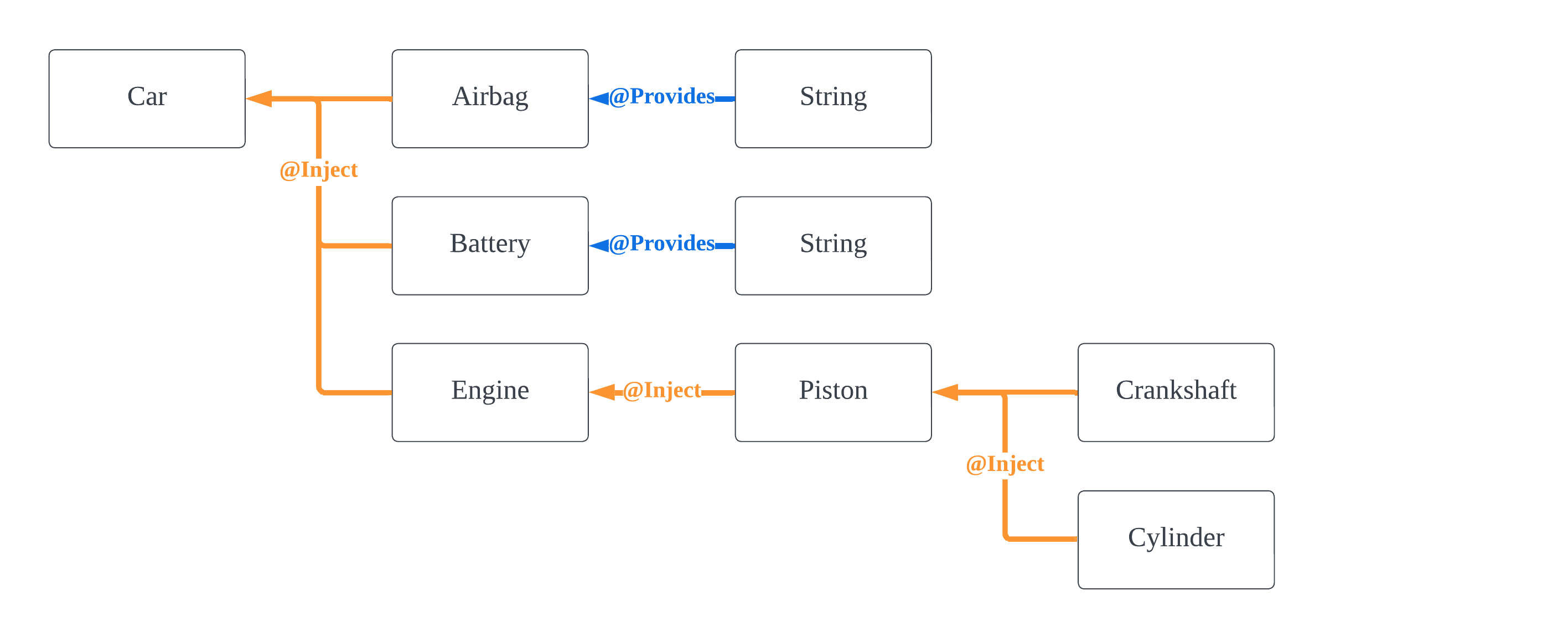 ์์ ๊ฐ์ด ๊ธฐ์กด ์์กด์ฑ ๊ทธ๋ํ์์ Airbag์ด Stringํ์ธ Dependency๋ฅผ ์๊ตฌํ๊ฒ ๋ง๋ ๋ค. String์ ์ฝ๊ธฐ ์ ์ฉ ํด๋์ค๋ค. ์ฆ, @Provides๋ก ์ ๊ณต๋์ด์ผ ํ๋ค.