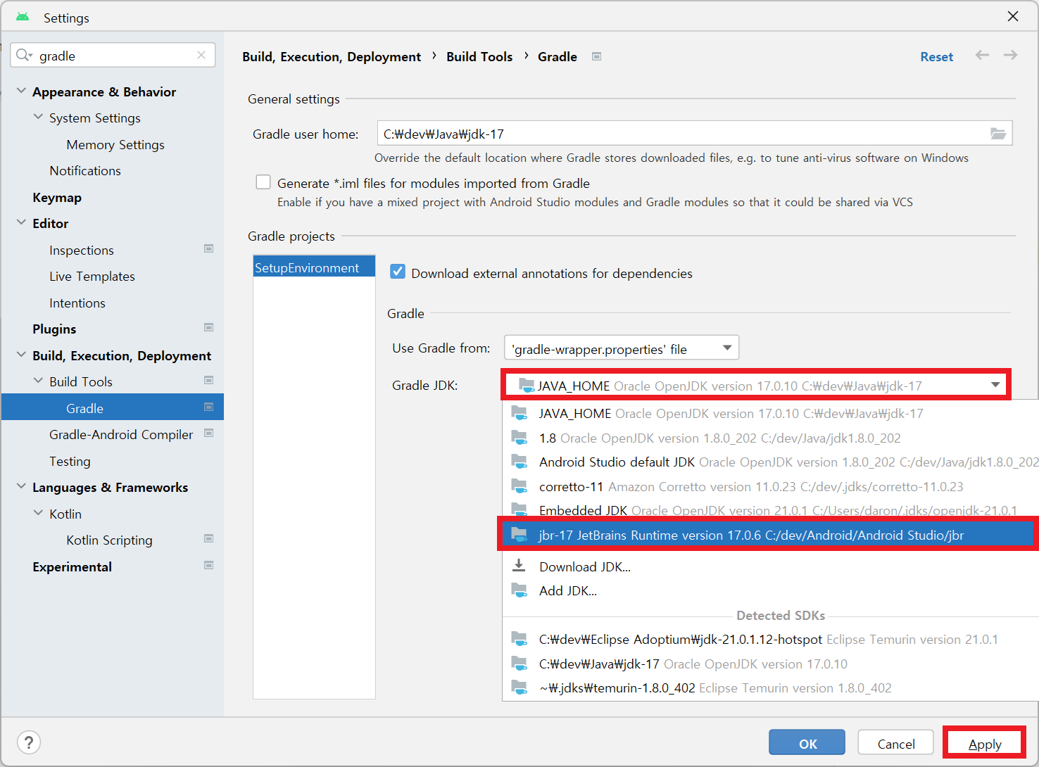 [File] - [Setting...] - [Build, Execution, Deployment] - [Build Tools] - [Gradle]์์ Gradle์ด ์ฌ์ฉํ JDK๋ฅผ ์ง์ ํ๋ค. General settings์์๋ JDK 17์ ๋๋ ํ ๋ฆฌ๋ฅผ ์ง์ ํ๋ค. Gradle projects์์๋ Gradle JDK๋ฅผ ์ค์ ํ๋ค. ์ด ๋ ์ด ๊ฒ์๊ธ์ ์ฐธ์กฐํด JDK 17 ์ค์น ๋ฐ ํ๊ฒฝ ๋ณ์ JAVA_HOME์ ์ค์ ํ๊ณ JAVA_HOME์ ์ ํํ๊ฑฐ๋, ์ด๋ฏธ ์ค์น๋ 17๋ฒ์ ์ JDK ๋๋ ํ ๋ฆฌ๋ฅผ ์ ํํ๋ค. ํ์์ ๋ฐฉ๋ฒ์ด ๋ ๊ฐํธํ๋ค. ๋ง์ฝ ๋ชฉ๋ก์ '์ด๋ฏธ ์ค์น๋ 17๋ฒ์ ์ JDK ๋๋ ํ ๋ฆฌ'๊ฐ ๋ณด์ด์ง ์๋๋ค๋ฉด, [Download JDK...]๋ฅผ ๋๋ฌ ๋ค์ด๋ก๋ํ๋ฉด ๋๋ค.