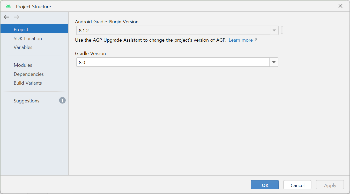 [File] - [Project Structure...]์์ ํ๋ก์ ํธ์ Gradle ๋ฒ์ ๋ฐ AGP(Android Gradle Plugin) ๋ฒ์ ์ ๊ฐ๊ฐ 8.0 ๋ฐ 8.1.2๋ก ์ ํํ๋ค.