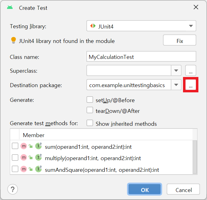 Create Test ์ฐฝ์์ Destination pacakge ์ ํ ๋ฒํผ ํด๋ฆญ