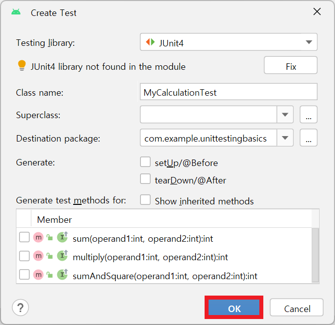 MyCalculation ํด๋์ค์ ํจ์๋ค์ ๋จ์ํ ์ํ์ ๊ณ์ฐ๋ง ์ํํ๋ฏ๋ก, ์ด๋ฌํ ํด๋์ค์ ํ ์คํธ๋ฅผ ์๋๋ก์ด๋ ์๋ฎฌ๋ ์ดํฐ์์ ์คํํ ํ์๊ฐ ์๋ค. ๋ฐ๋ผ์ Local unit test์ ์ํ๋ unitTest ๋๋ ํ ๋ฆฌ๋ฅผ ์ ํํ๋ค (Instrumented test๋ Unit Test๋ผ๋ ๋ฒ์ฃผ์ ์ํ์ง๋ง, ์๋๋ก์ด๋ ์๋ฎฌ๋ ์ดํฐ๋ฅผ ์ฌ์ฉํ๋ค๋ ์ ์์ ์จ์ ํ(?) Unit Test๋ ์๋๊ธฐ์ ์ด๋ ๊ฒ ๋๋ ๋์๋ค ๋ณด๋ค).