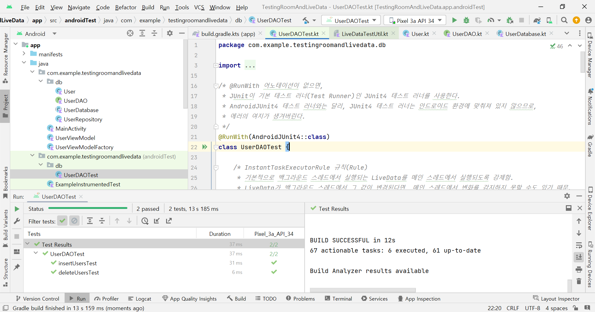๋ด๊ฐ ํ ์คํธํ ํด๋์ค๋ UserDAO๋ค. ์ด๋ ์ธํฐํ์ด์ค์ด๊ธฐ์ ์ฌ๊ธฐ์ ์งํํ ๊ฒ์ฒ๋ผ ํ ์คํธ ํด๋์ค ์์ฑ์ ํ ์๋ ์๋ค ([Generate...] ๋ฉ๋ด ๋ค์์ผ๋ก [Test...] ๋ฉ๋ด๊ฐ ์ ๋ธ). ํ์ง๋ง, ๊ทธ๋ฅ ์ง์ ์๋์ผ๋ก ํ ์คํธ ํด๋์ค๋ฅผ ๋ง๋ค๋ฉด ๊ทธ๋ง์ด๋ค. Room ๋ผ์ด๋ธ๋ฌ๋ฆฌ๋ฅผ ์ฌ์ฉํด์ผํ๊ธฐ ๋๋ฌธ์ Instrumented test๋ก ์งํํ๋ค. ๋ฐ๋ผ์, androidTest ๋๋ ํ ๋ฆฌ์ ํ ์คํธ ํด๋์ค๋ฅผ ์์ฑํ๋ค. LiveDataTestUitl.kt๋ผ๋ ํ์ผ๋ ๋ณด์ด๋๋ฐ, ๊ณง๋ฐ๋ก ์ค๋ช ํ์๋ฉด