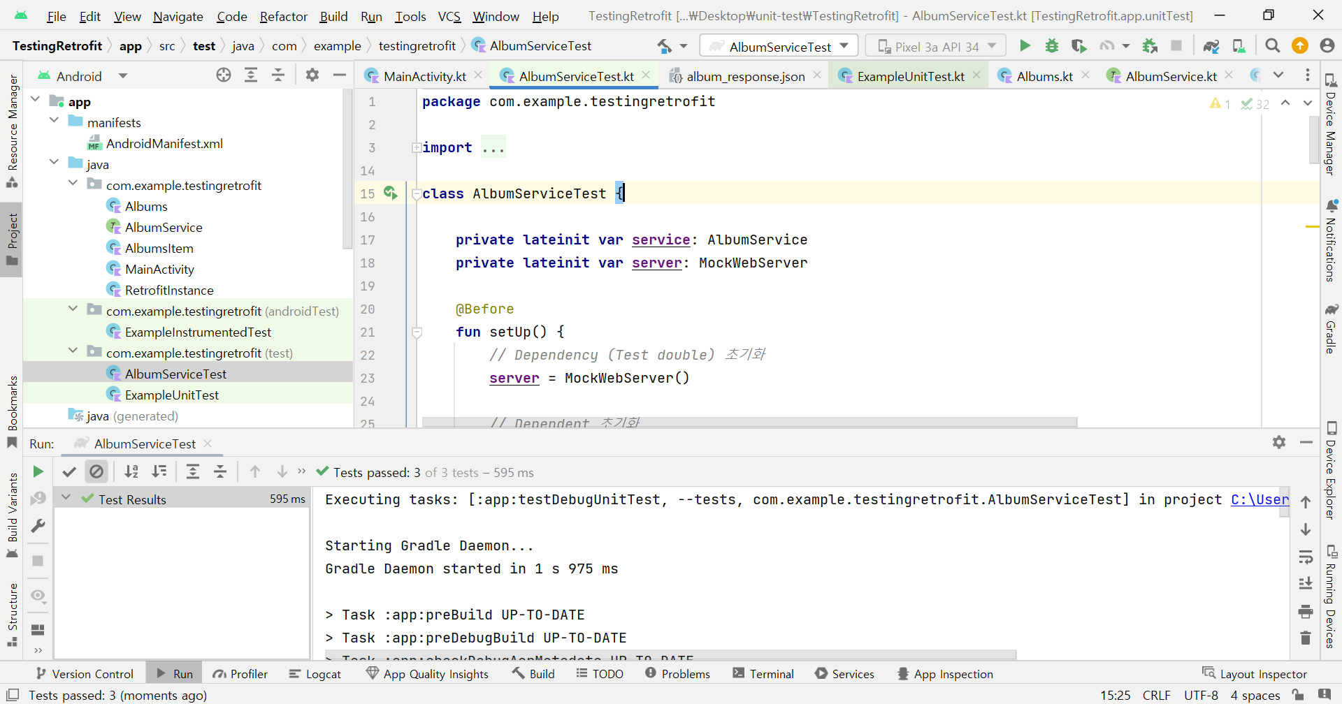 ์ ๋งํฌ์ ์๋ ์ด์ ๊ฒ์๊ธ์ ์ด์ด์, ์ค์ ์๋๋ก์ด๋ ํ๋ก์ ํธ๋ฅผ ๋ง๋ค์ด Retrofit์ Unit Testing์ ์ํํด๋ณธ๋ค. ๋ณธ ๊ฒ์๊ธ์ ์ฝ๊ธฐ ์ ์ [Android] Unit Testing - ๊ธฐ์ด๋ฅผ ๋ณด๊ณ ์ค๋ฉด ์ดํด์ ๋์์ด ๋๋ค.