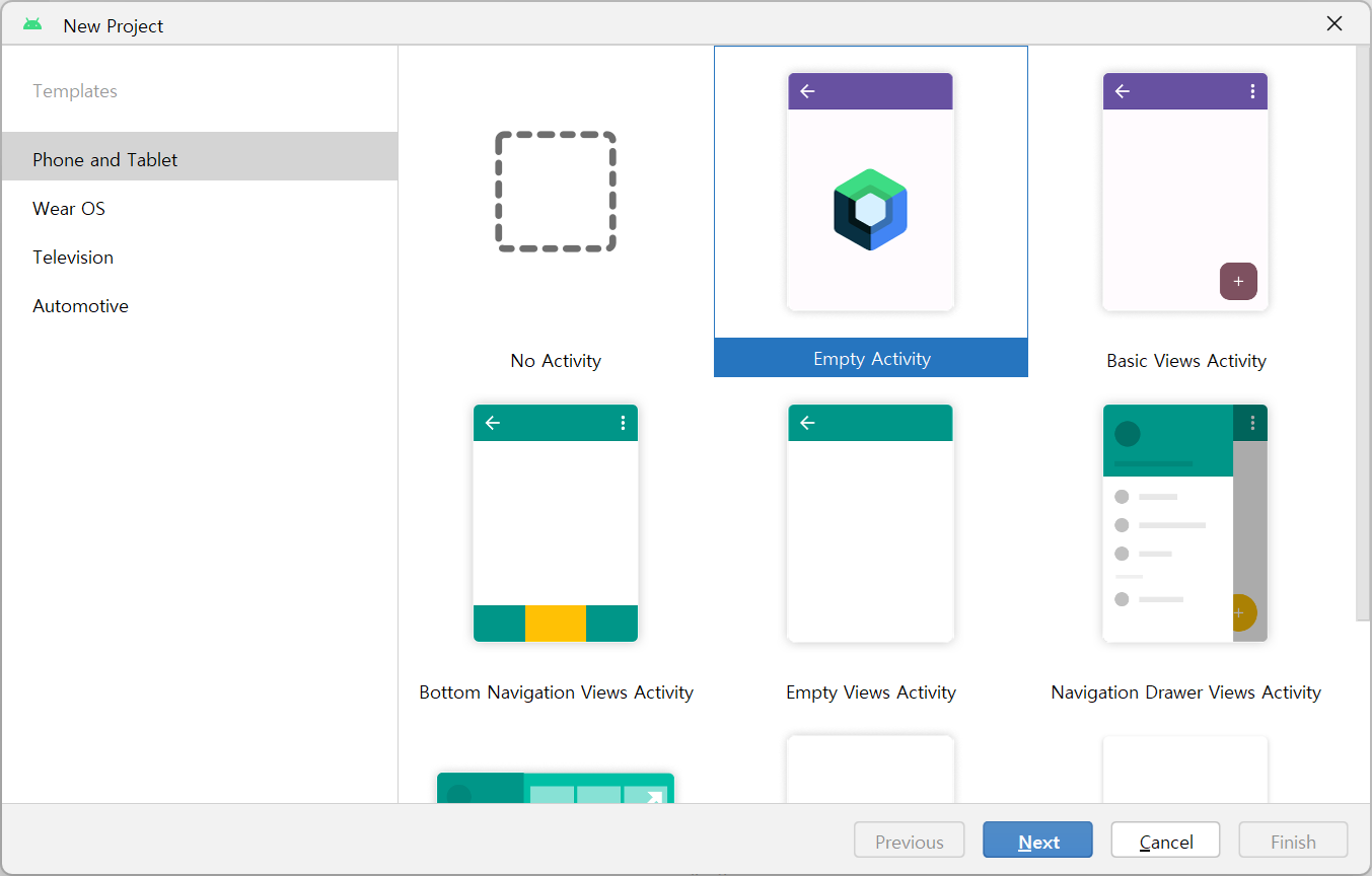 Empty Activity๋ฅผ ์ ํํ๋ค. ํด๋น ํญ๋ชฉ์ Jetpack Compose ์์ด์ฝ๋ ๋ณด์ธ๋ค.