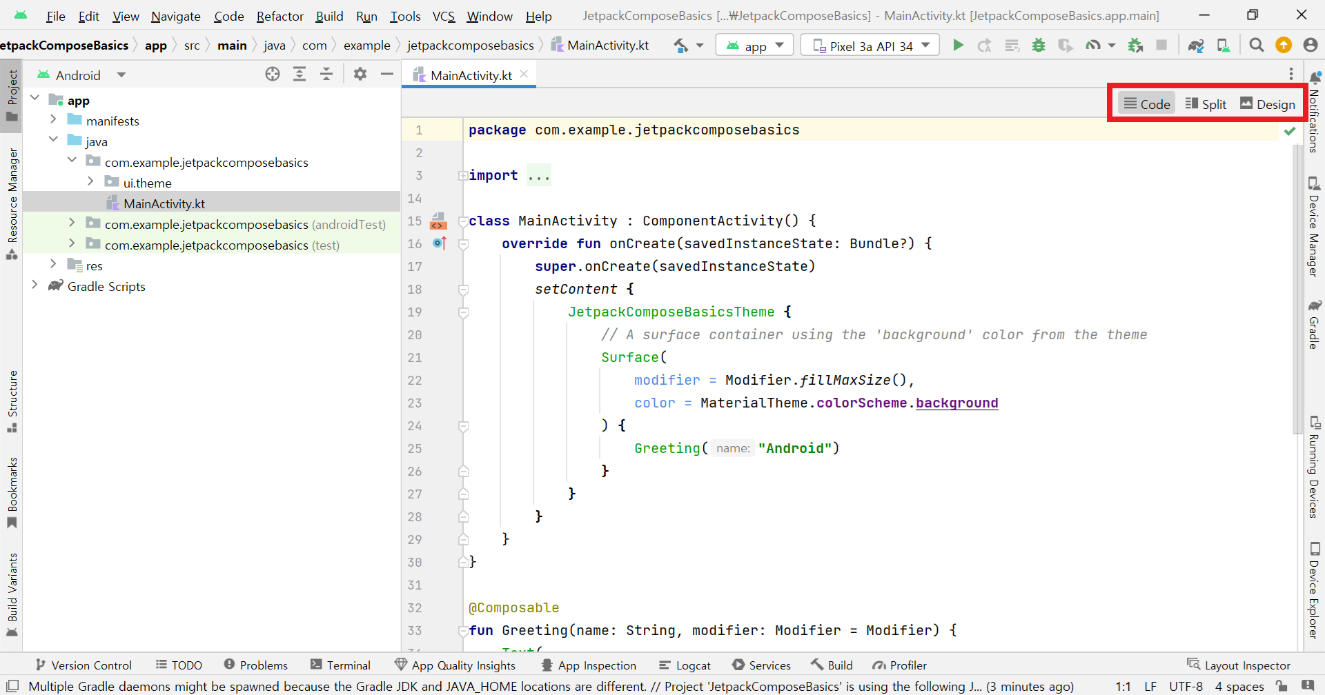 ํ๋ก์ ํธ๋ฅผ ๋ง๋ค๋ฉด ๋ฏ์ ์ฝ๋๋ค์ด ๋ค์ด์๋ MainActivity๊ฐ ๋ฐ๊ฒจ์ค๋ค. ๊ทธ๋ฐ๋ฐ, XML ์ฝ๋์์ ๋ณด๋ [Code / Split / Design] ํญ ์ ํ ๋ฒํผ์ด ๋ณด์ธ๋ค. ์ด๋ MainActivity๊ฐ ๊ทธ ์์ฒด๋ก UI๊น์ง ๊ทธ๋ ค๋ด๊ธฐ ๋๋ฌธ์ด๋ค.