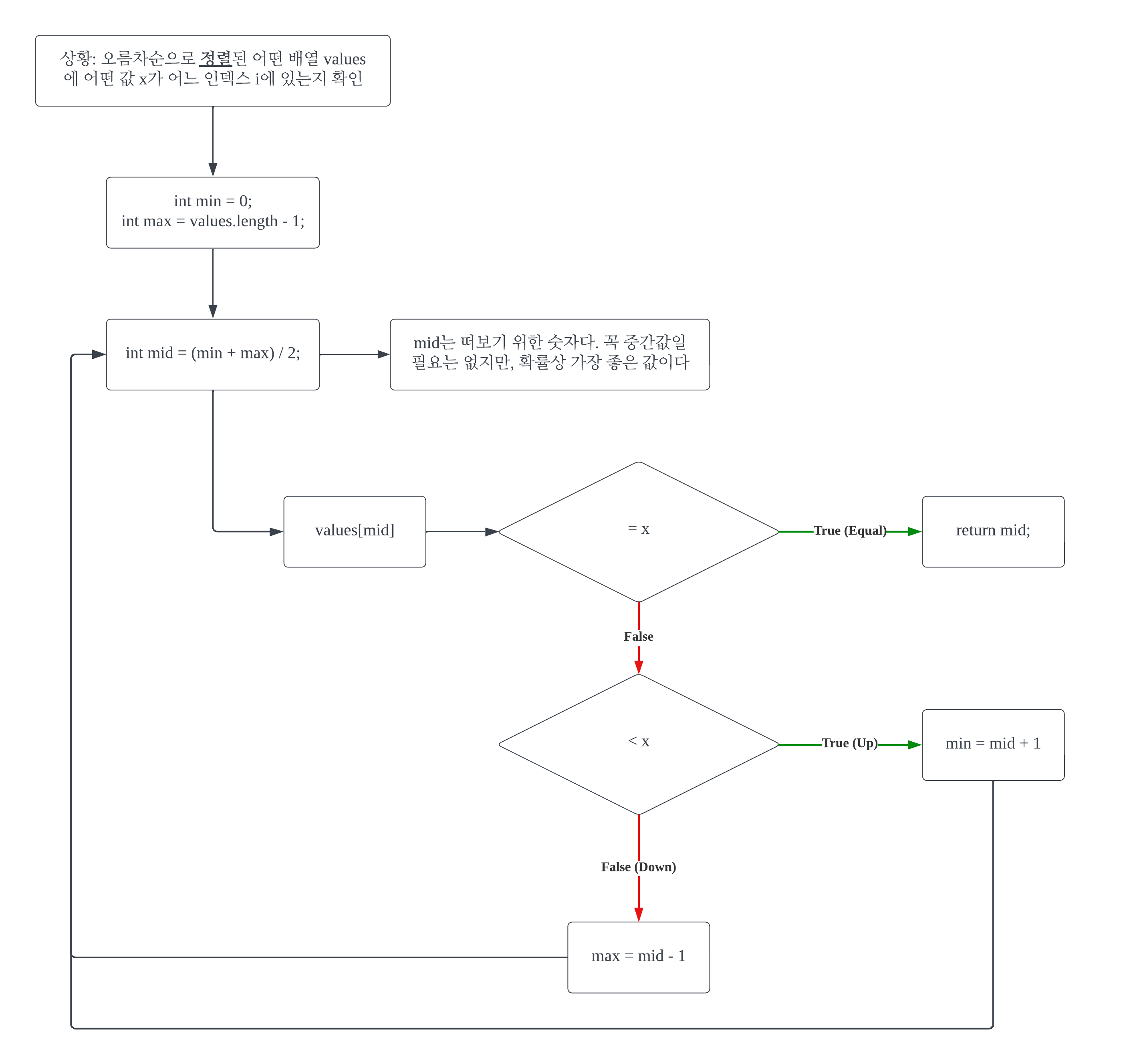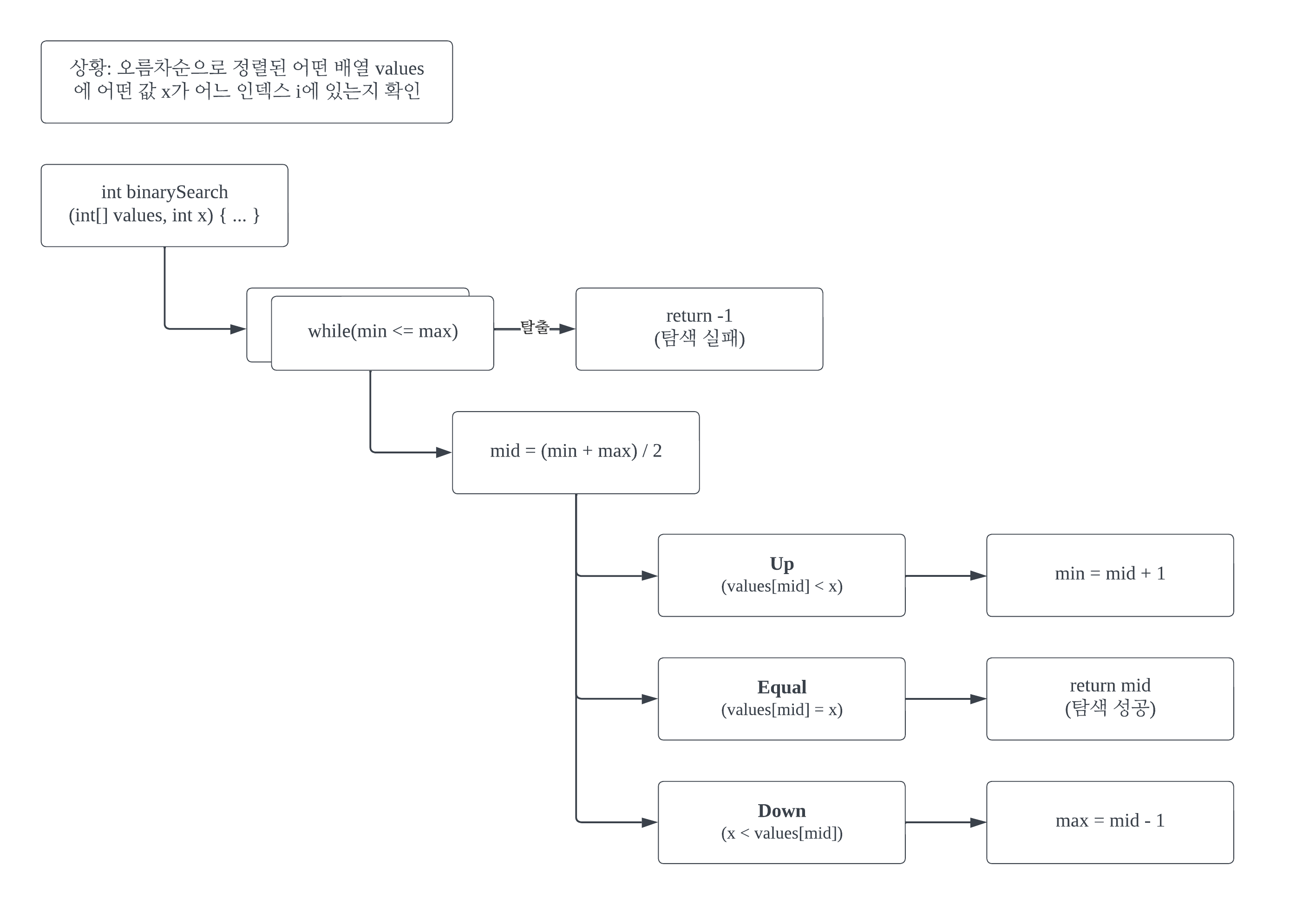 Upμ΄λΌκ³ νλ¨νλ κΈ°μ€μΈ value[mid] < xμ μλ―Έλ xκ°μ μΈλ±μ€ iκ° midλ³΄λ€ ν¬λ€(Up)λ μλ―Έλ€. iλ binarySearch()μμ λ°ν(return)ν κ°μ΄λ€.