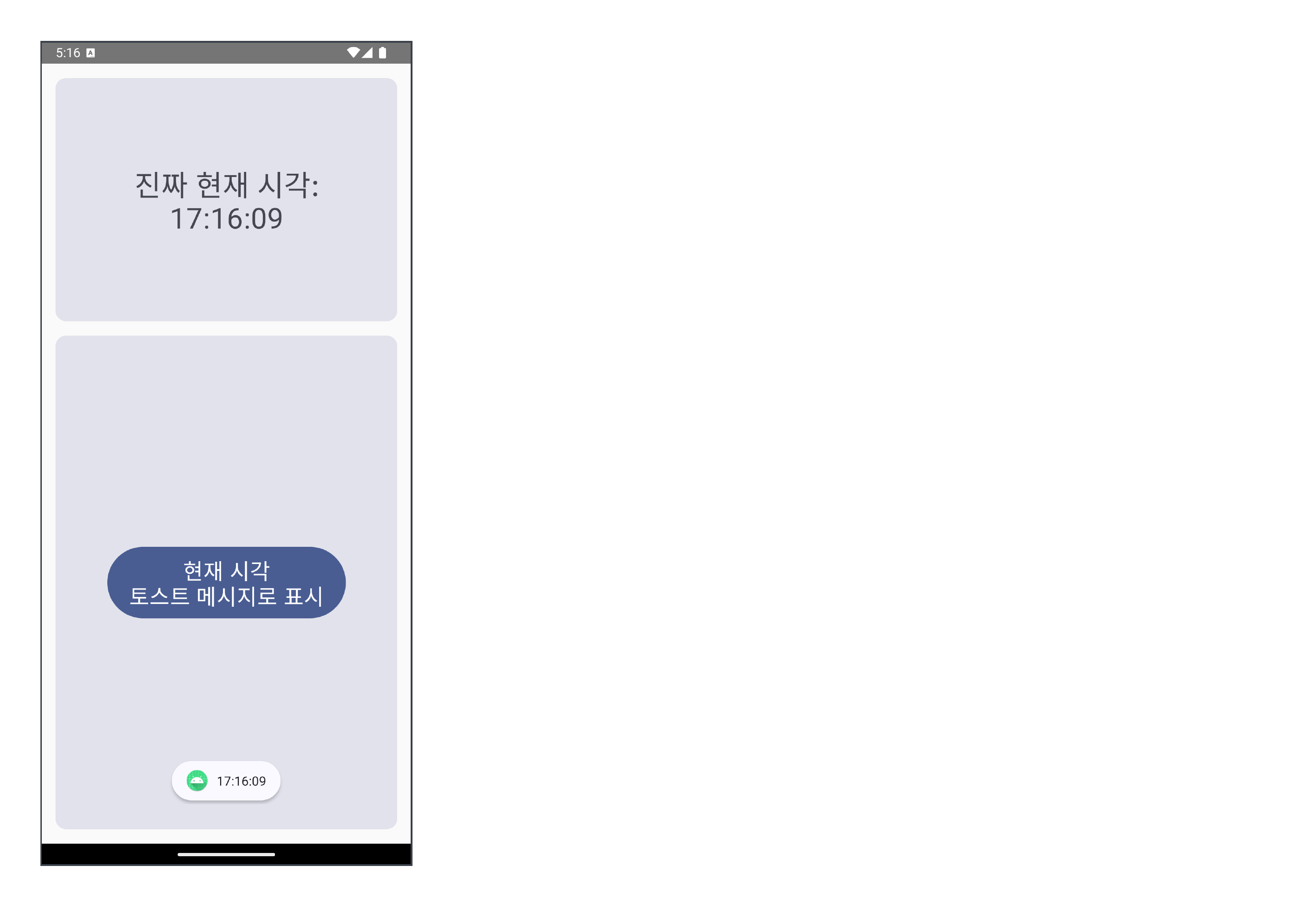 ๋ฒํผ์ ๋๋ฅด๋ฉด 5์ด ๋ค์ ํ ์คํธ ๋ฉ์์ง๋ก ์๊ฐ์ ํ์ํ๋ ์ฑ์ด๋ค.