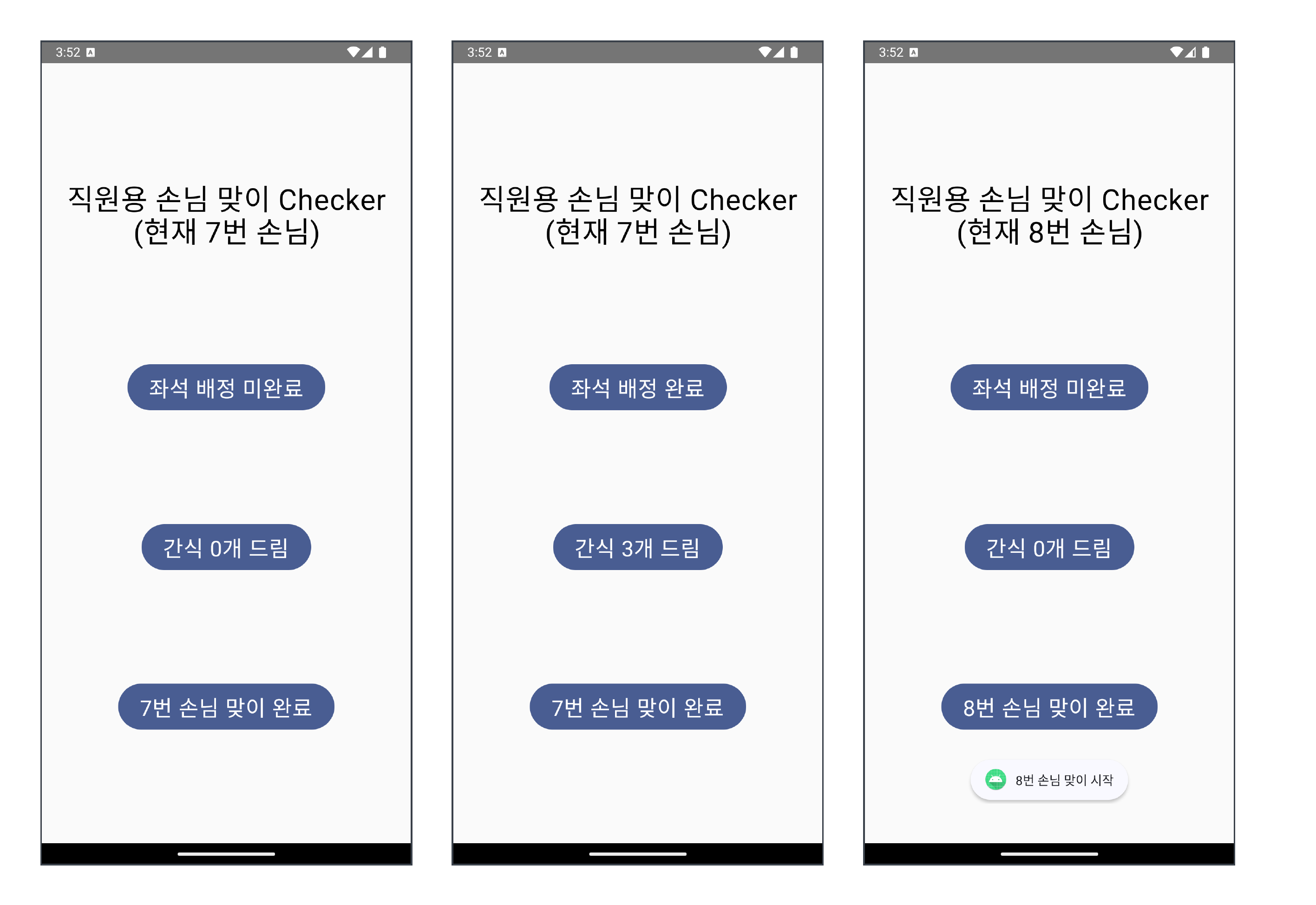 ์๋์ ์๋ํ๋ ์ ๋ฌด๋ฅผ ๋งก์ ์ง์์๊ฒ ์ ๊ณต๋ ์ฑ ํ๋ฉด์ด๋ค. ์ฒซ๋ฒ์งธ ๋ฒํผ์ ๋๋ฅด๋ฉด ์ข์ ๋ฐฐ์ ์๋ฃ / ๋ฏธ์๋ฃ๊ฐ ์ ํ๋๋ค. ๋๋ฒ์งธ ๋ฒํผ์ ๋๋ฅด๋ฉด ์๋์๊ฒ ๋๋ฆฐ ๊ฐ์ ๊ฐฏ์๋ฅผ ์นด์ดํธ์ ํ ์ ์๋ค. ์ธ๋ฒ์งธ ๋ฒํผ์ ๋๋ฅด๋ฉด ํ์ฌ ์๋ ์๋๊ฐ ์ข ๋ฃ๋๊ณ ๋ค์ ์๋ ์๋๋ก ๋์ด๊ฐ๋ค. ์ด ๋, "n๋ฒ ์๋ ๋ง์ด ์์"์ด๋ผ๋ ํ ์คํธ ๋ฉ์์ง๋ ๊ฐ์ด ์ถ๋ ฅ๋๋ค.