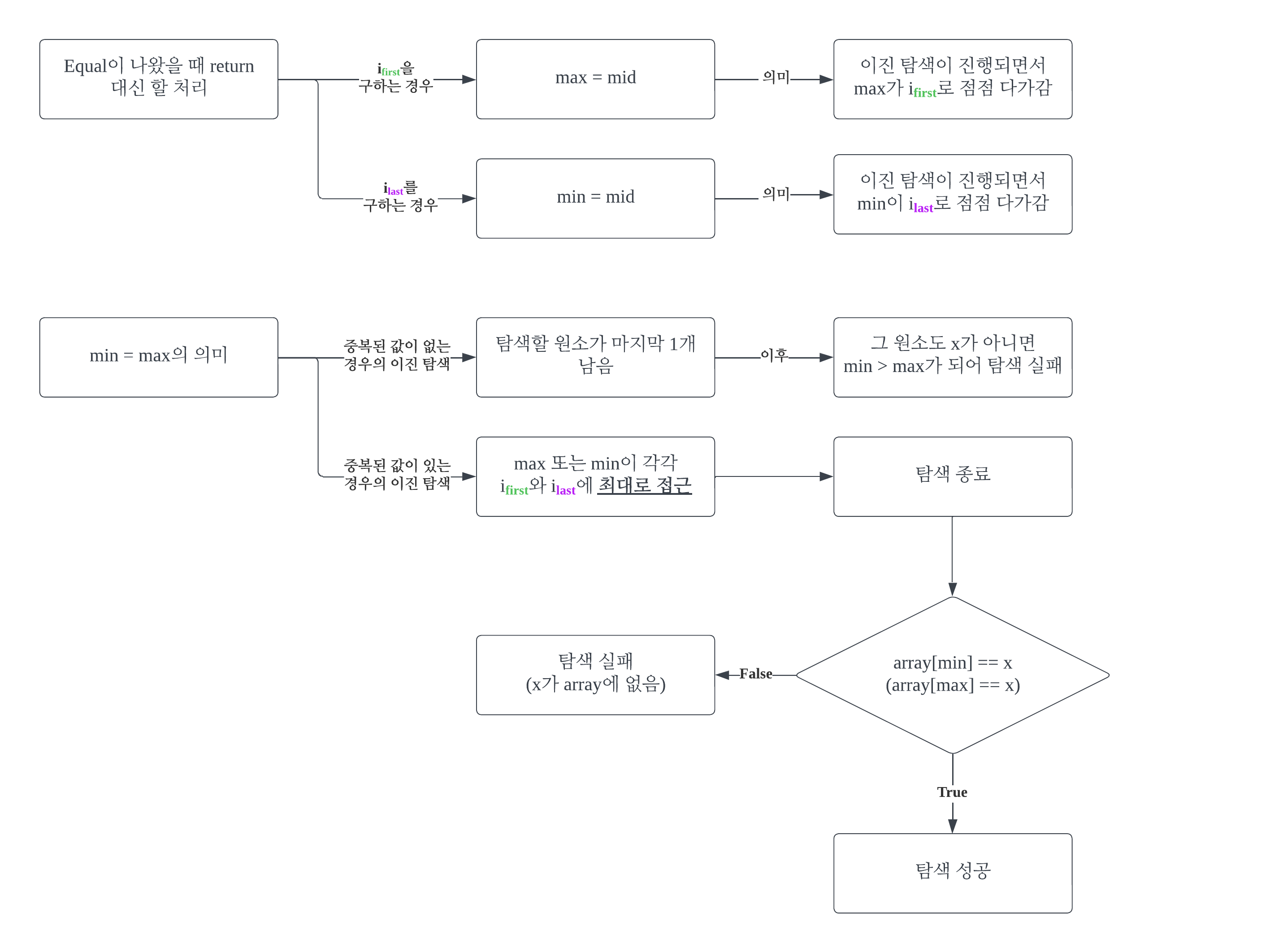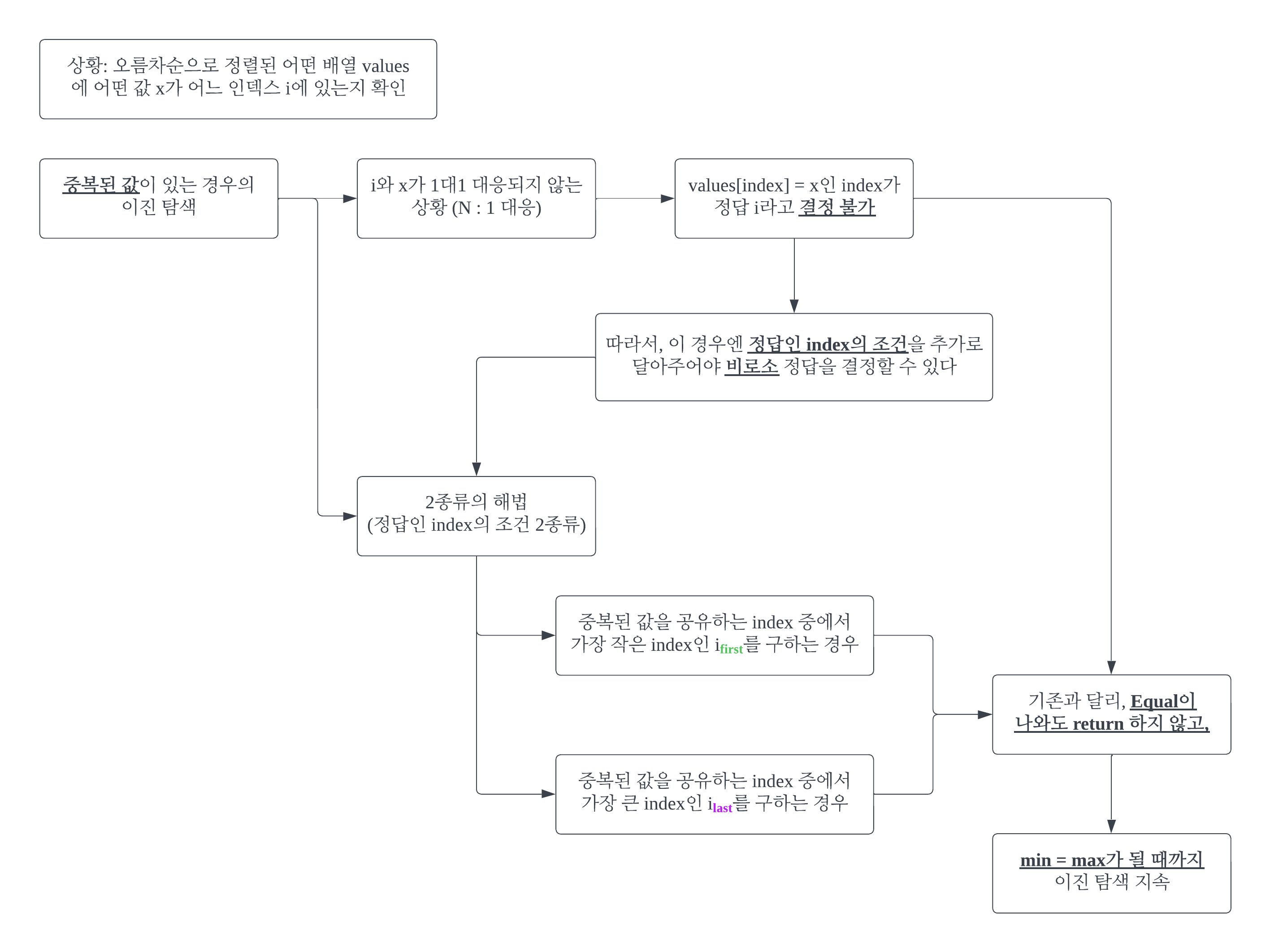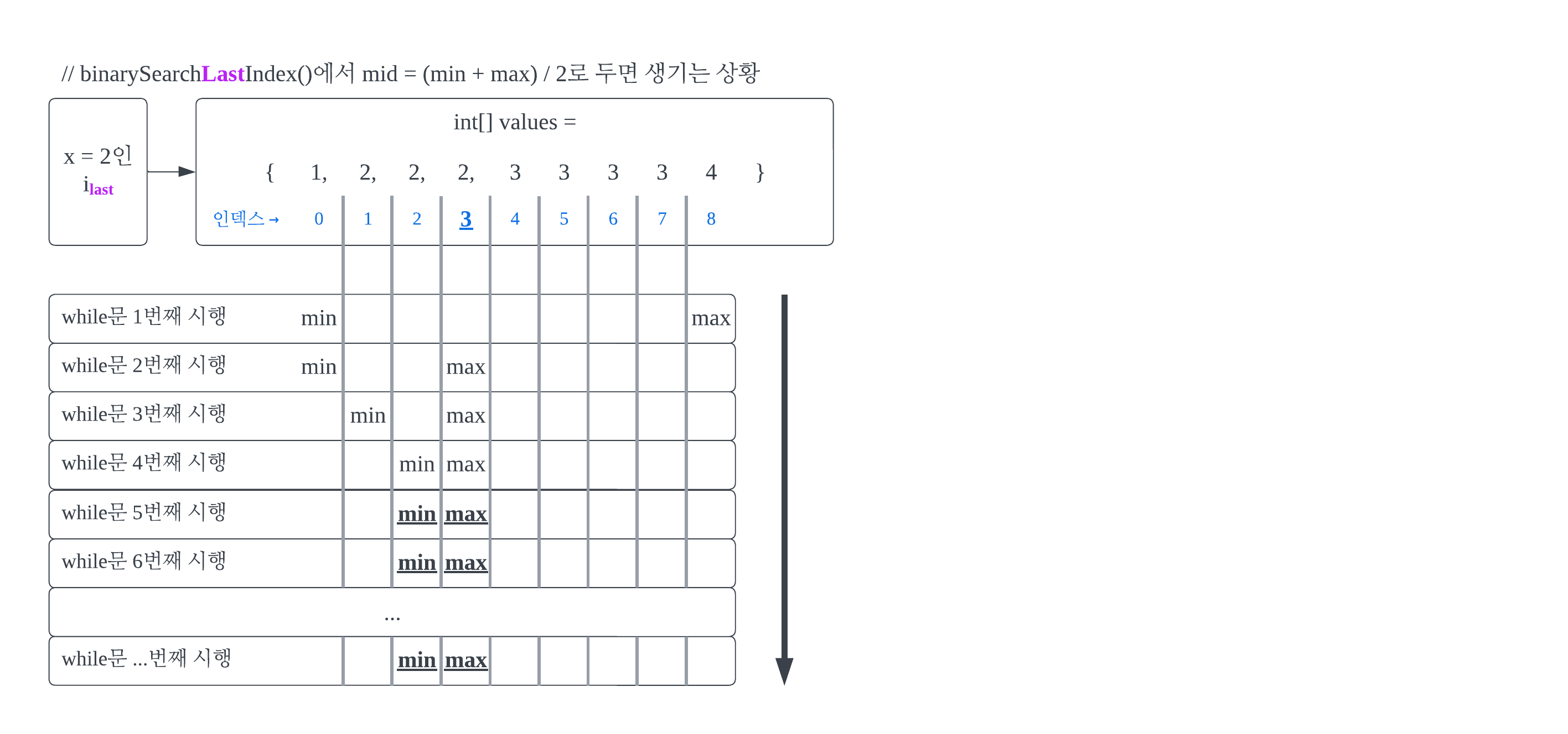 ์ค๋ณต๋ ๊ฐ์ด ์๋ ๊ฒฝ์ฐ์ ์ด์ง ํ์์์ min < max๊ฐ ๋๋ ์์ ์ด while์ ํ์ถ ์์ ์ด์๋ค. ๋ฐ๋ฉด, ์ค๋ณต๋ ๊ฐ์ด ์๋ ๊ฒฝ์ฐ์ ์ด์ง ํ์์์ min = max๊ฐ ๋๋ ์์ ์ด while์ ํ์ถ ์์ ์ด๋ค. min = max๋ ๊ฒ์ ๋ฒ์๊ฐ i์ ์ต๋๋ก ์ ๊ทผ ์ฆ, ์์ ๊ฐ์ ๊ฐ์ด ๋์๋ค๋ ์๋ฏธ๋ค.