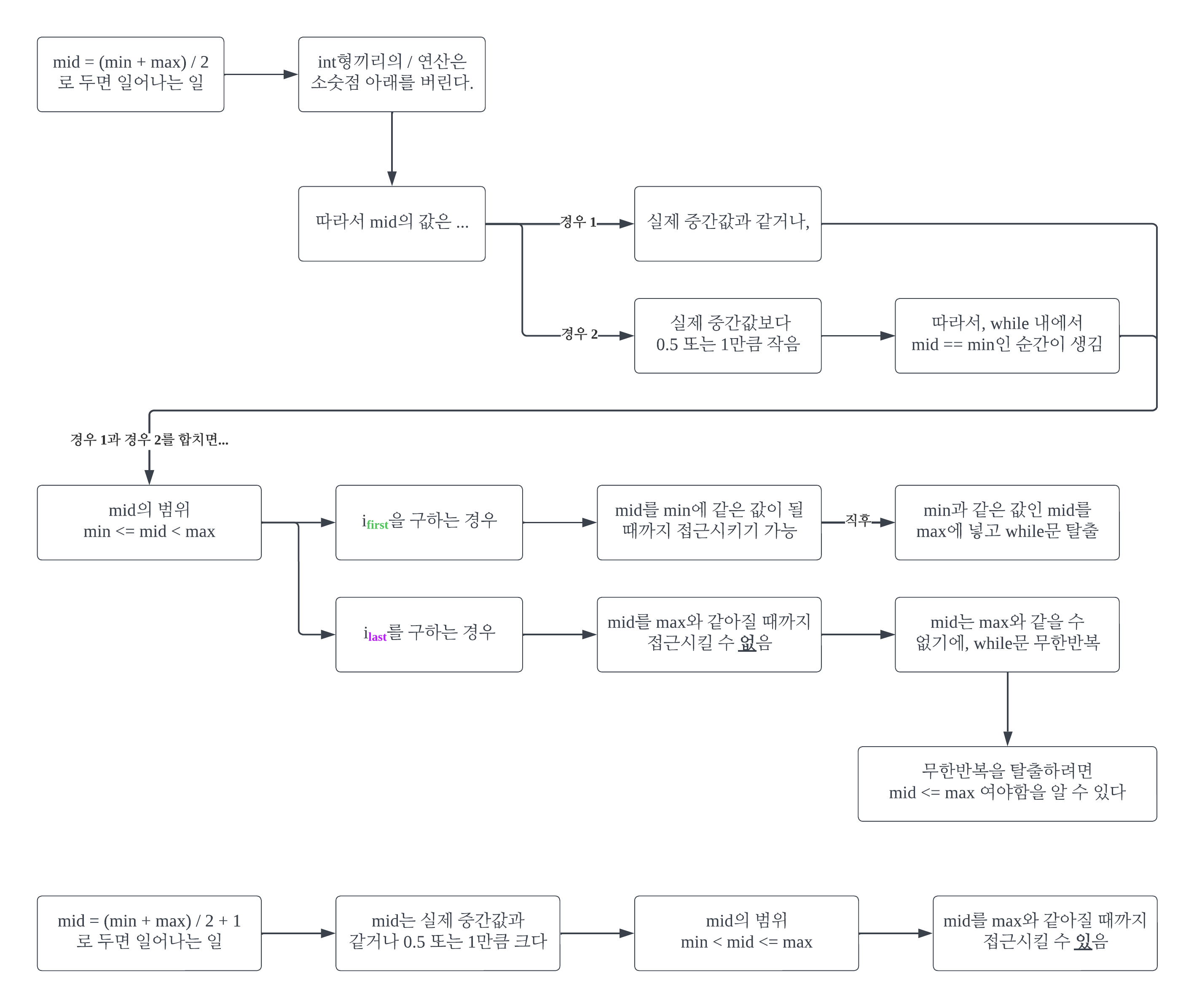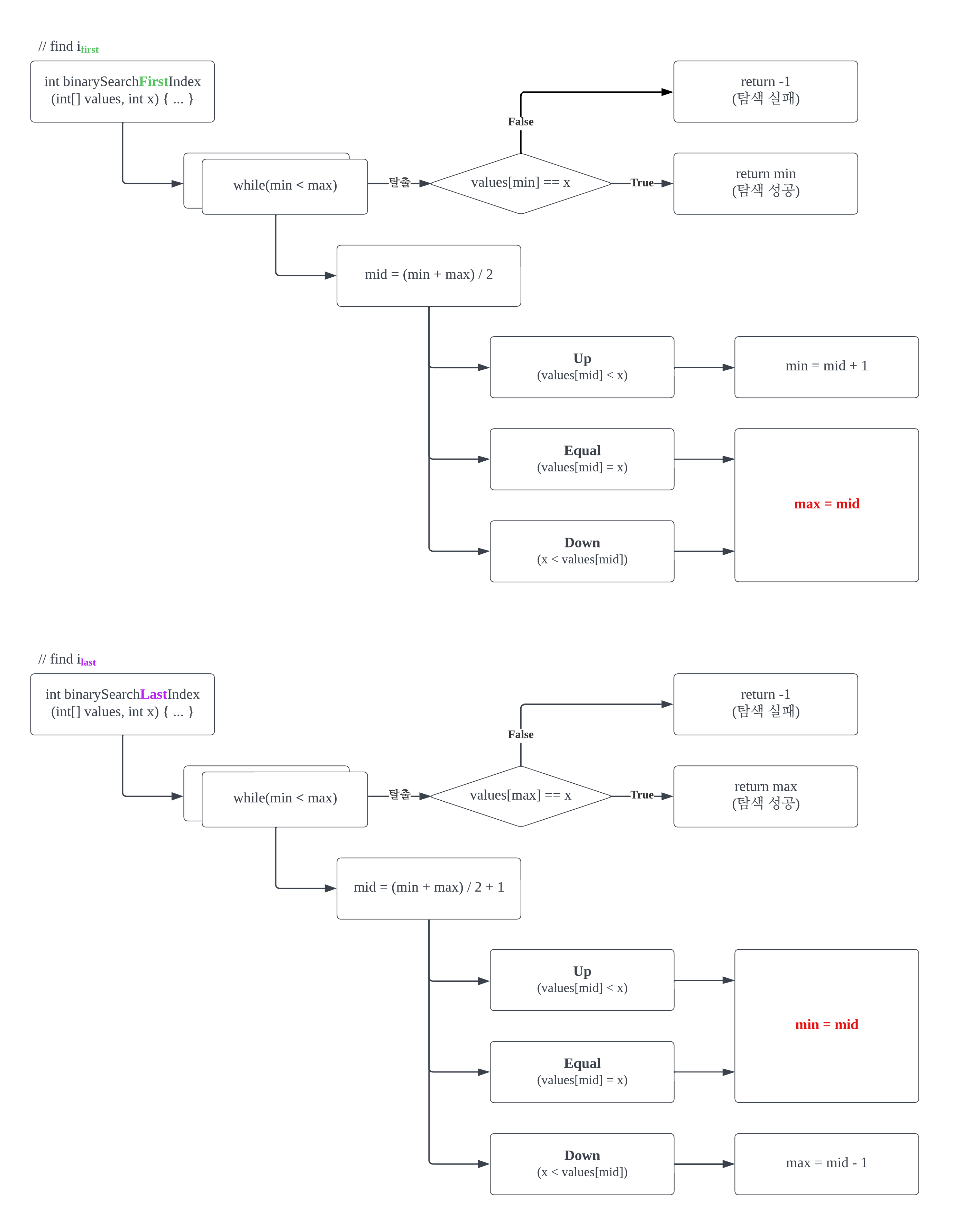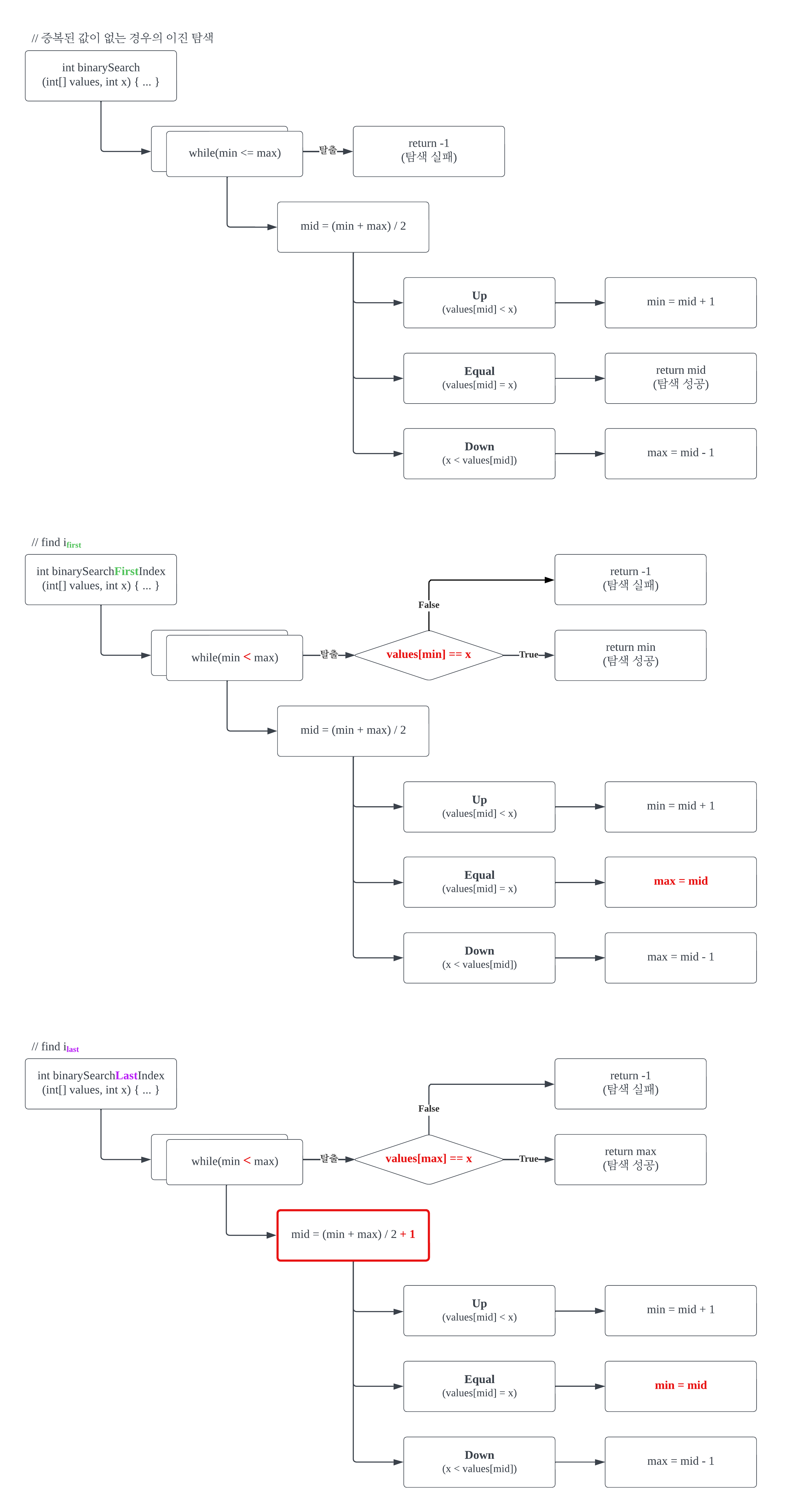 ์ค๋ณต๋ ๊ฐ์ด ์๋ ๊ฒฝ์ฐ์ ์ด์ง ํ์์์ min < max๊ฐ ๋๋ ์์ ์ด while์ ํ์ถ ์์ ์ด์๋ค. ๋ฐ๋ฉด, ์ค๋ณต๋ ๊ฐ์ด ์๋ ๊ฒฝ์ฐ์ ์ด์ง ํ์์์ min = max๊ฐ ๋๋ ์์ ์ด while์ ํ์ถ ์์ ์ด๋ค. min = max๋ ๊ฒ์ ๋ฒ์๊ฐ i์ ์ต๋๋ก ์ ๊ทผ ์ฆ, ์์ ๊ฐ์ ๊ฐ์ด ๋์๋ค๋ ์๋ฏธ๋ค.