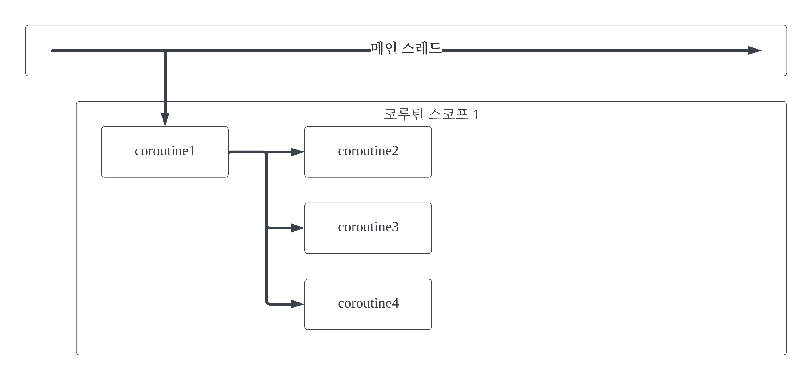 ์ด 4๊ฐ์ ์ฝ๋ฃจํด์ด ์ํ๋๋ฉฐ, ๊ทธ ์ฝ๋ฃจํด์ ๊ฐ๊ฐ ๋ค๋ฅธ ์ฝ๋ฃจํด ์ค์ฝํ์ ๋ค์ด์๊ฒ ๋๋ค. ์ด ๋์๋์์ coroutine2 ~ 4๊ฐ coroutine1์ ๊ณ์ธต ๊ตฌ์กฐ๋ฅผ ์ด๋ฃฌ๋ค๊ณ ์คํดํด์๋ ์ ๋๋ค. coroutine2 ~ 4์ coroutine1์ ์ฝ๋ ๋ด์ฉ์ ์ํด ์์ฑ๋์์ ๋ฟ ์๋ฌด๋ฐ ๊ด๋ จ์ด ์๋ค (๋ฌผ๋ก ํธ์ถํจ-ํธ์ถ๋จ์ด๋ผ๋ ๊ด์ ์์๋ ๊ณ์ธต ๊ตฌ์กฐ๋ฅผ ์ด๋ฃฌ๋ค๊ณ ๋ณผ ์ ์์ง๋ง, ์ผ๋ฐ์ ์ผ๋ก ๊ณ์ธต ๊ด๊ณ๋ฅผ ์๋ฏธํ๋ ๋ถ๋ชจ-์์ ๊ด๊ณ๋ ์๋๋ผ๋ ๋ง์ด๋ค).