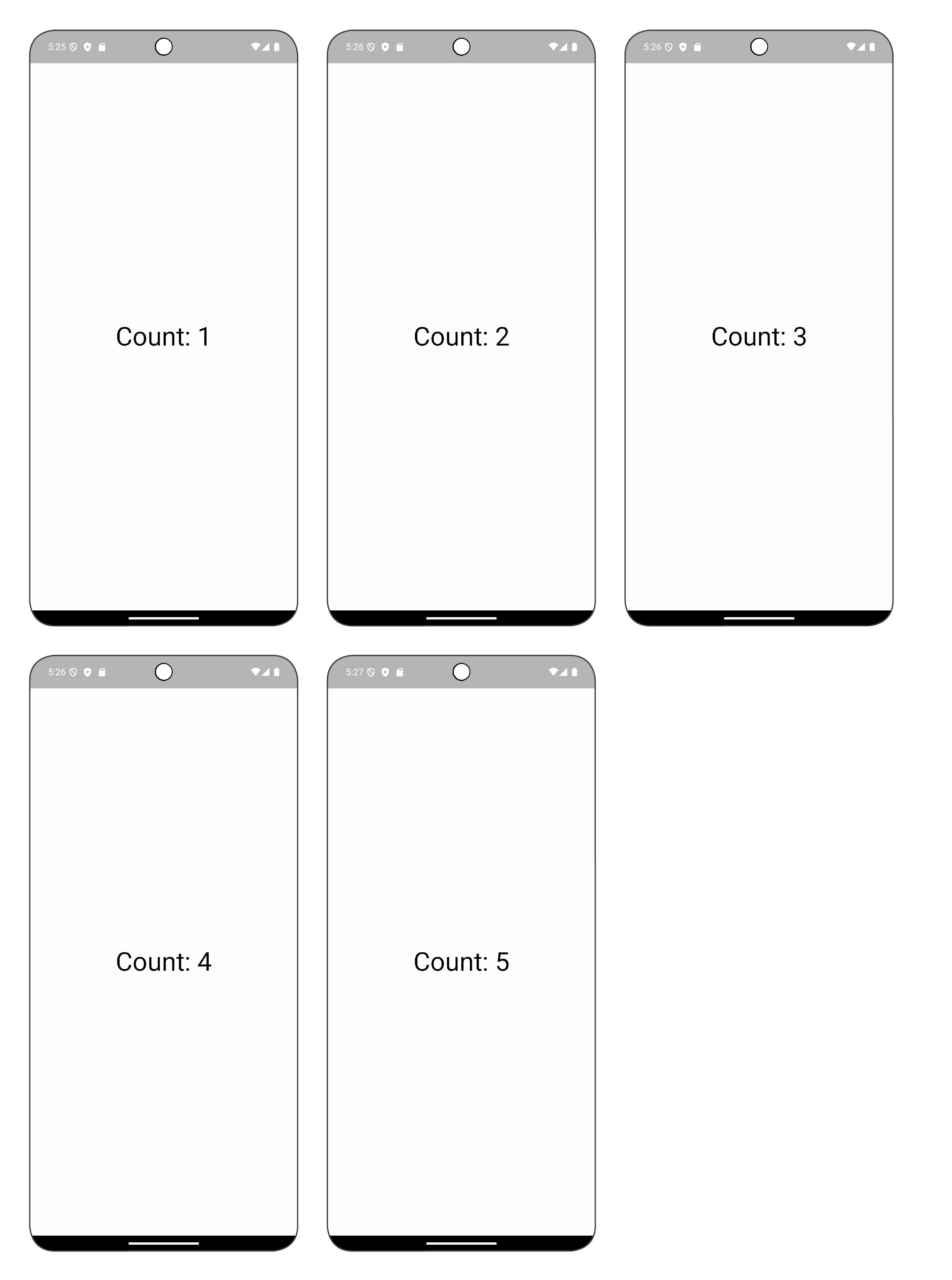 ๋ฐ๋ฉด, remember { ... }๋ก ๊ฐ์ธ๋ฉด, Count: 1์ผ๋ก ์์ํด Count: 5๊น์ง ํ์ํ๋ Text๊ฐ ์๋ํ ๋๋ก ์ ํ์๋๋ค.
