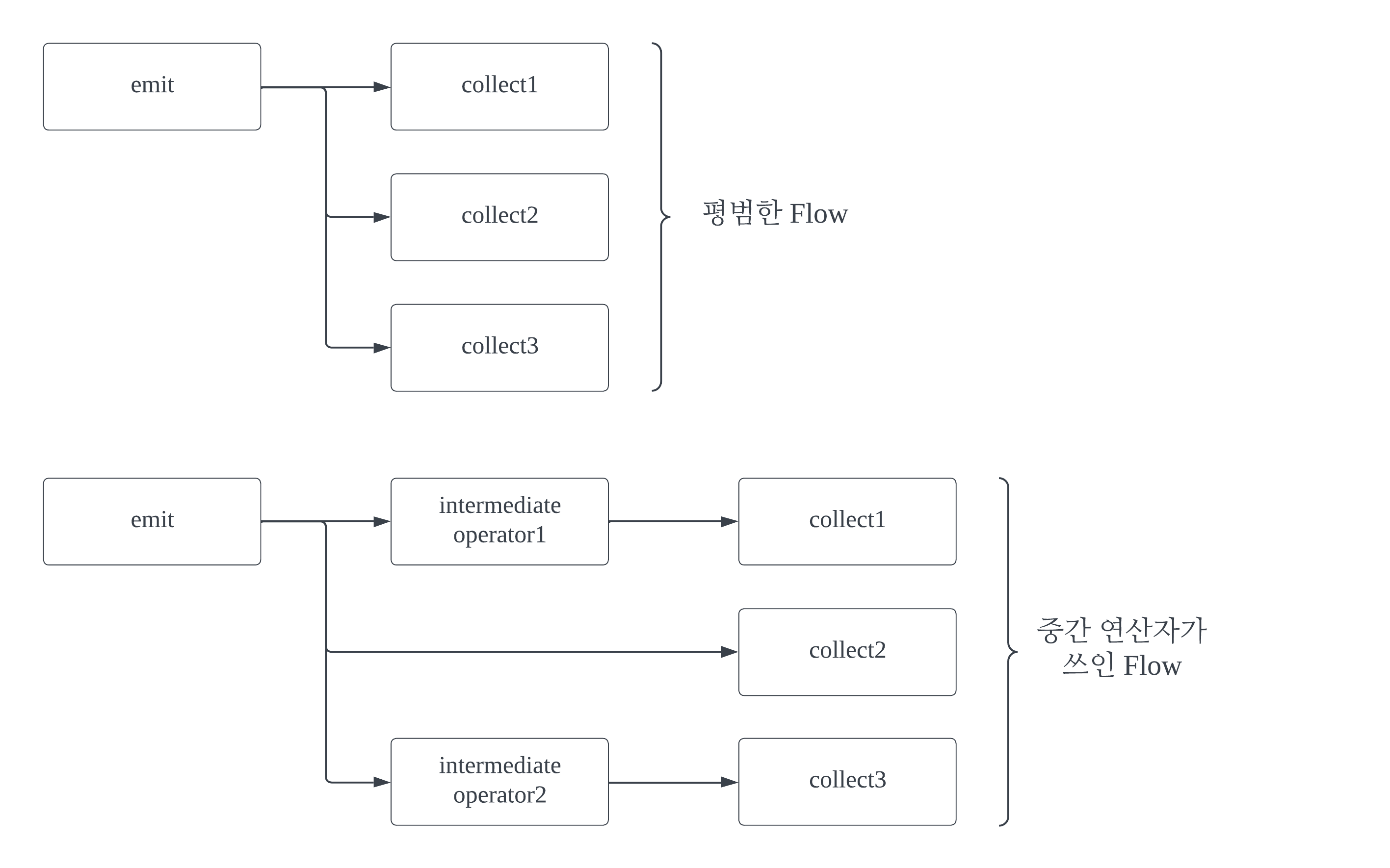 ์ค๊ฐ ์ฐ์ฐ์๋ ์ด๋ฆ ๊ทธ๋๋ก์ ์ญํ ์ ์ํํ๋ค. ์ด๋ฆ์ ์๋ '์ค๊ฐ'์, emit๊ณผ collect ์ฌ์ด '์ค๊ฐ'์ ์๋ฏธํ๋ค. ์์์ ์ด emit์ด๊ณ ๋์ฐฉ์ ์ด collect์ธ ๋ฐฐ์๊ด ์ ๋ฌผ์ ํ๋ฆ์ intermediate operator๊ฐ ํ์ด์ฌํนํ๋ ๋๋์ด๋ผ๊ณ ๋ณด๋ฉด ๋๋ค. ์ฌ๊ธฐ์ ์ค์ํ ์ ์, ์์ผ๋ก(=๋ฏธ๋์) emit๋ ๋ฐ์ดํฐ๋ฅผ ๋ณํํ๋ ์ฐ์ฐ์๋ ๊ฒฐ์ฝ ์๋๋ผ๋ ๊ฒ์ด๋ค. ์ด๋ฏธ(=๊ณผ๊ฑฐ์) emit๋ ๋ฐ์ดํฐ์ ํน์ ์ฐ์ฐ์ ๊ฐํ์ฌ, collect์ ์ ๋ฌํ๋ ์ฐ์ฐ์๋ค. ์ค๊ฐ ์ฐ์ฐ์์ด๋ ๋ง์ด๋ค.