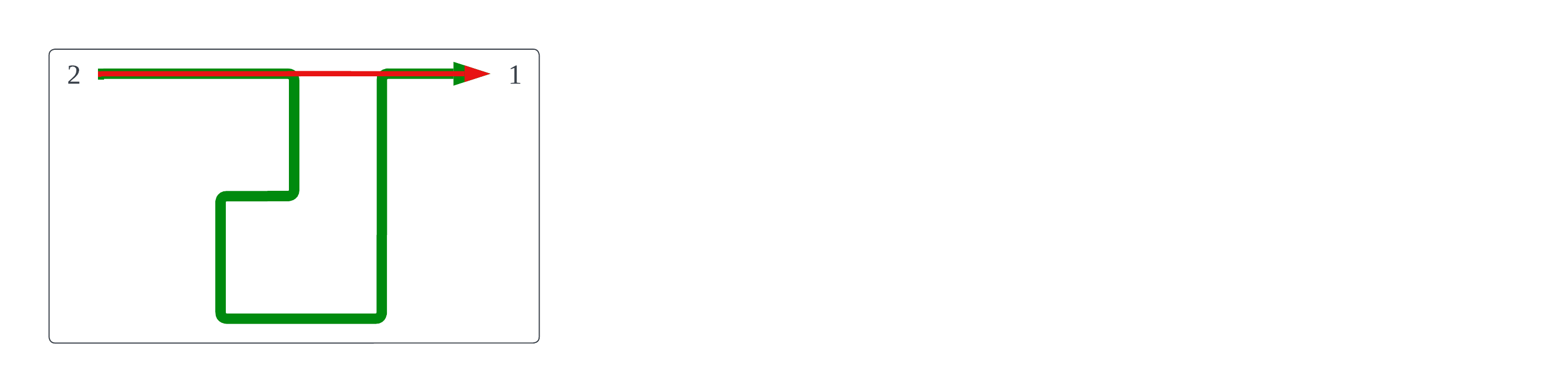 2차원이라면 문제가 복잡해진다. 선의 길이와 '최단 거리'가 비례하지 않는다. 2에서 1로 가는 빨간색 선은 '최단 거리'면서 동시에 '목표 지점(2)으로부터 한번 움직일 때마다 +1한 값'이다. 초록색 선은 '최단 거리'는 아니지만, 빨간색 선과 마찬가지로 '목표 지점(2)으로부터 한번 움직일 때마다 +1한 값'이다. 정리하면, 2차원에서 '최단 거리'는 반드시 '목표 지점(2)으로부터 한번 움직일 때마다 +1한 값'이지만, 역으로 '목표 지점(2)으로부터 한번 움직일 때마다 +1한 값'이 '최단 거리'는 아니게 된다.