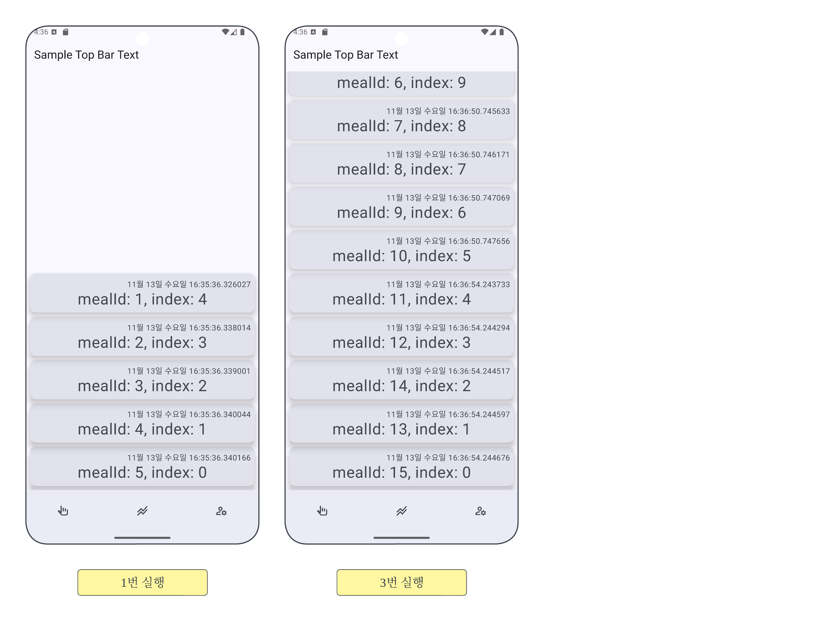 NutrientScreen์ LaunchedEffect()์ ์ํด ๋งค ์คํ๋ง๋ค Meal ๊ฐ์ฒด๊ฐ 5๊ฐ์ฉ INSERT๋๋ค.