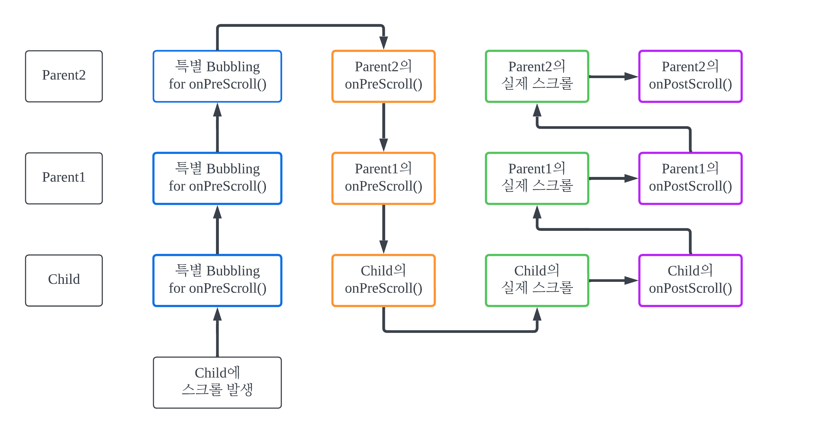 ๊ทธ๋ฌ๋ #2-3์์ ๋งํ๋ฏ, ๋ช ์์ ์ค์ฒฉ ์คํฌ๋กค์ (ํ๋ก๊ทธ๋๋จธ์ ์ํด ์๋์ ์ผ๋ก) ์์ฐ์ค๋ฝ์ง ์์์ผ ํ๋ค. ์ฆ ๋ถ๋ชจ๊ฐ ์์๋ณด๋ค ๋จผ์ ์ฌ์ฉ์์ ์คํฌ๋กค์ ๋ฐ์ํด์ผ ํ๋ค. ๊ทธ '๋ฐ์'์ ๋๋ณํ๋ ํจ์๊ฐ ๋ฐ๋ก onPreScroll()์ด๋ค. ๊ทธ๋ฆฌ๊ณ onPreScroll()์ ์คํ์ ๋ถ๋ชจ → ์์์ ๋ฐฉํฅ์ผ๋ก ํ๊ธฐ ์ํด์ ๊ฐ์ฅ ๊ทน๋จ์ ์์นํ ํ ๋ถ๋ชจ๋ฅผ ์ฐพ์์ผ ํ ๊ฒ์ด๋ค. ๊ทธ๋์ 'ํน๋ณํ' ์ด๋ฒคํธ ๋ฒ๋ธ๋ง์ ํตํด ๊ฐ์ฅ ๋์ ์๋ ๋ถ๋ชจ๊น์ง ๊ฐ ํ, ๋ค์ ๋์์ค๋ฉฐ ์ญ์์ผ๋ก onPreScroll()์ ์ํํ๋ค. 'ํน๋ณ'ํ๋ค๊ณ ํ ์ด์ ๋, ์ด ์ด๋ฒคํธ ๋ฒ๋ธ๋ง์ด Modifier.verticalScroll()์ด๋ Modifier.scrollable() ๋ฑ์ ๋ค๋ฅธ ๋ฉ์๋๋ค์ ๋ฌด์ํ๊ณ ์ค์ง Modifier.nestedScroll()๋ง์ ์ถ์ ํด ์ฌ๋ผ๊ฐ๊ธฐ ๋๋ฌธ์ด๋ค. ์ฆ ์ด ๊ณผ์ ์์ nestedScroll()์ด ์๋ ๋ค๋ฅธ ์คํฌ๋กค ๊ด๋ จ ๋ฉ์๋๋ค์ ์คํ๋์ง ์๋๋ค.