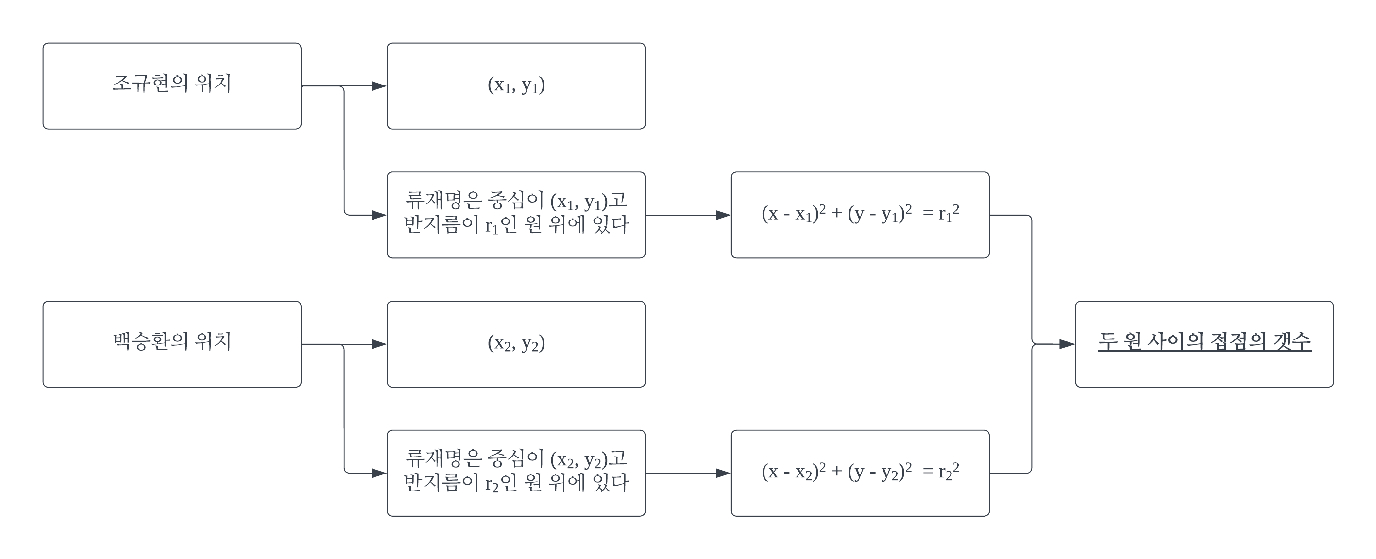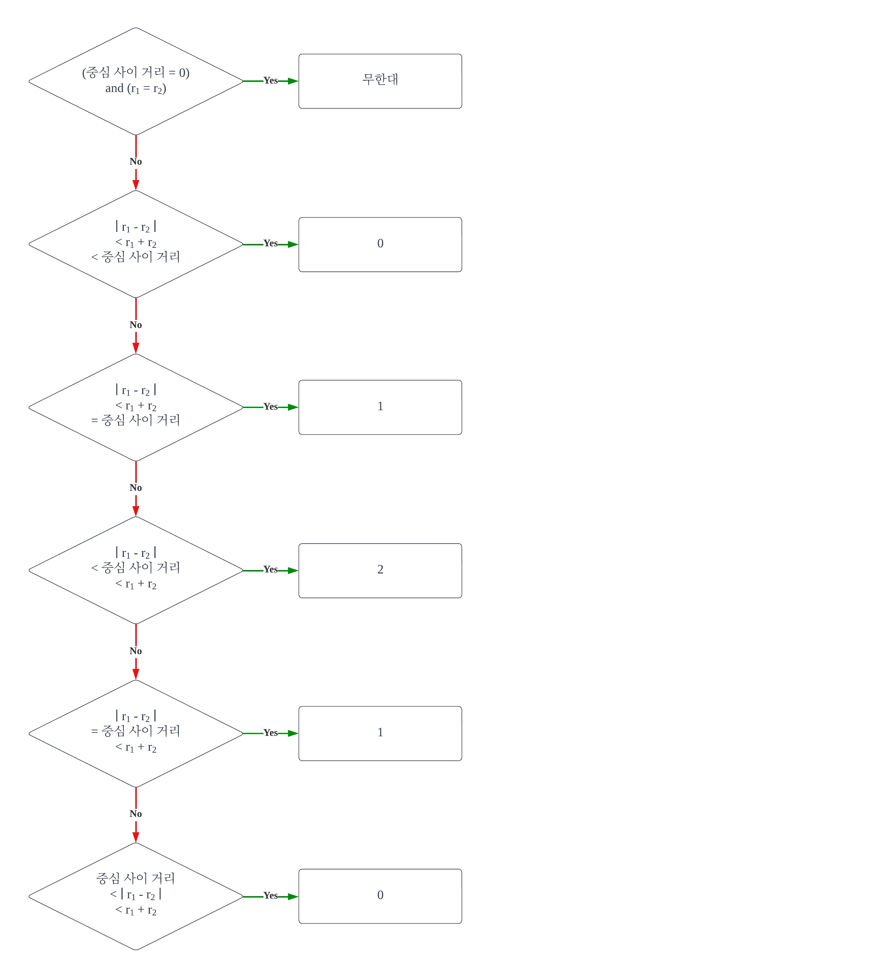 첫째는, 크기 비교라서 굳이 제곱근을 취하지 않아도 동일한 결과가 나오기 때문이다. 문제에서 x1, y1, r1, x2, y2, r2의 값은 정수라는 조건이 있다. 따라서, 제곱근을 취하지 않는 이상 int형만으로도 계산이 가능하다.