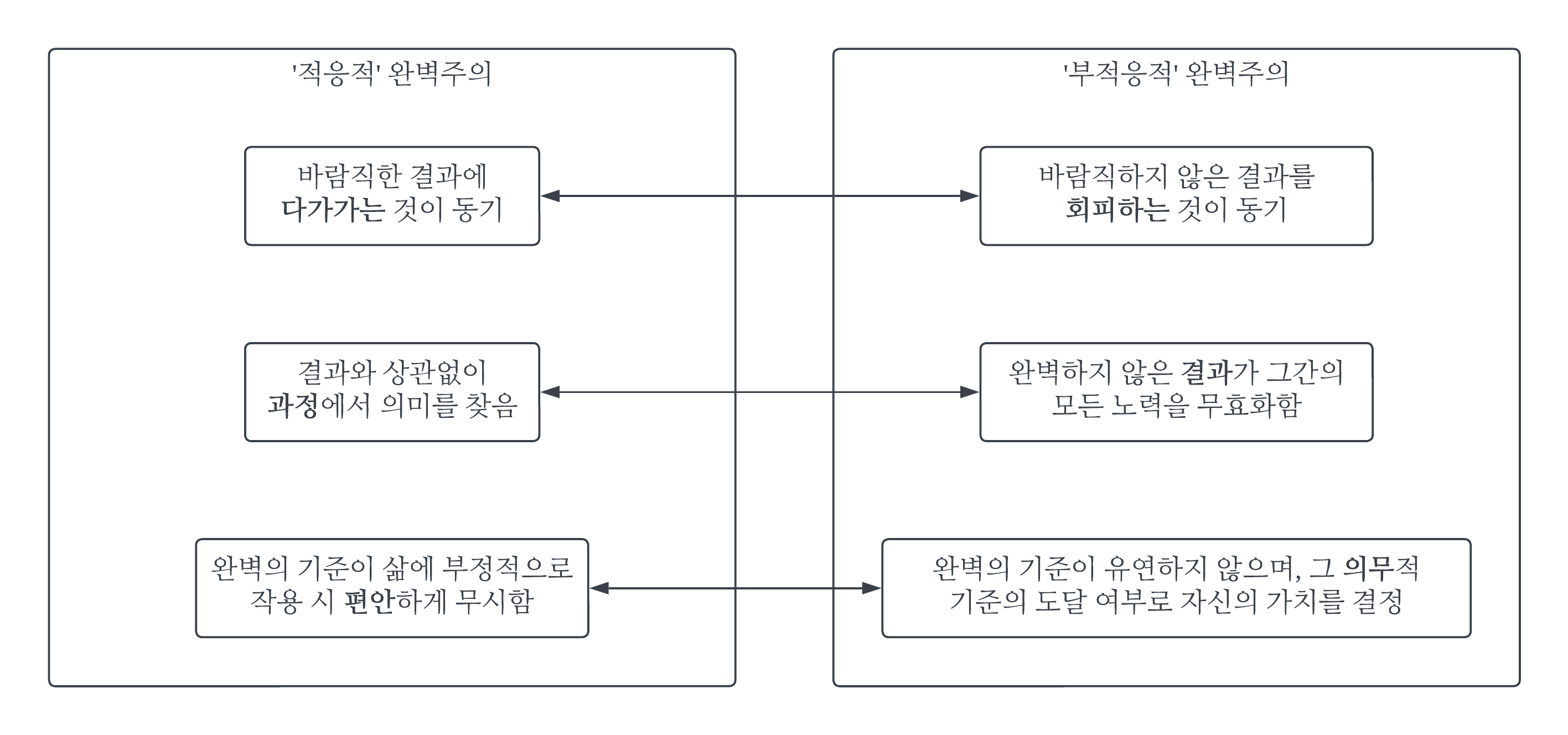 μ μμ μλ²½μ£Όμλ μ±μ·¨λ₯Ό μν΄ λ Έλ ₯νλ λ°λ©΄, 'λΆμ μμ ' μλ²½μ£Όμλ μ€ν¨λ₯Ό νΌνκΈ° μν΄ λ Έλ ₯νλ€. λΆμ μμ μλ²½μ£Όμλ λͺ¨μμ μκ³ μλ€. μ€μ€λ‘ μ ν΄λμ κΈ°μ€μ λλ¬νμ΄λ μ±κ³΅μΌλ‘ μΉμ§ μλλ€. λλ¬ν μ μμλ€λ©΄, μ μ΄μ λ무 μ¬μ΄ λͺ©νμκΈ° λλ¬Έμ΄λ€. κ²°κ΅ μ£μ± κ°, λ²μμ, ννΌλ‘ μ΄μ΄μ§κ³ λ§λ€.
