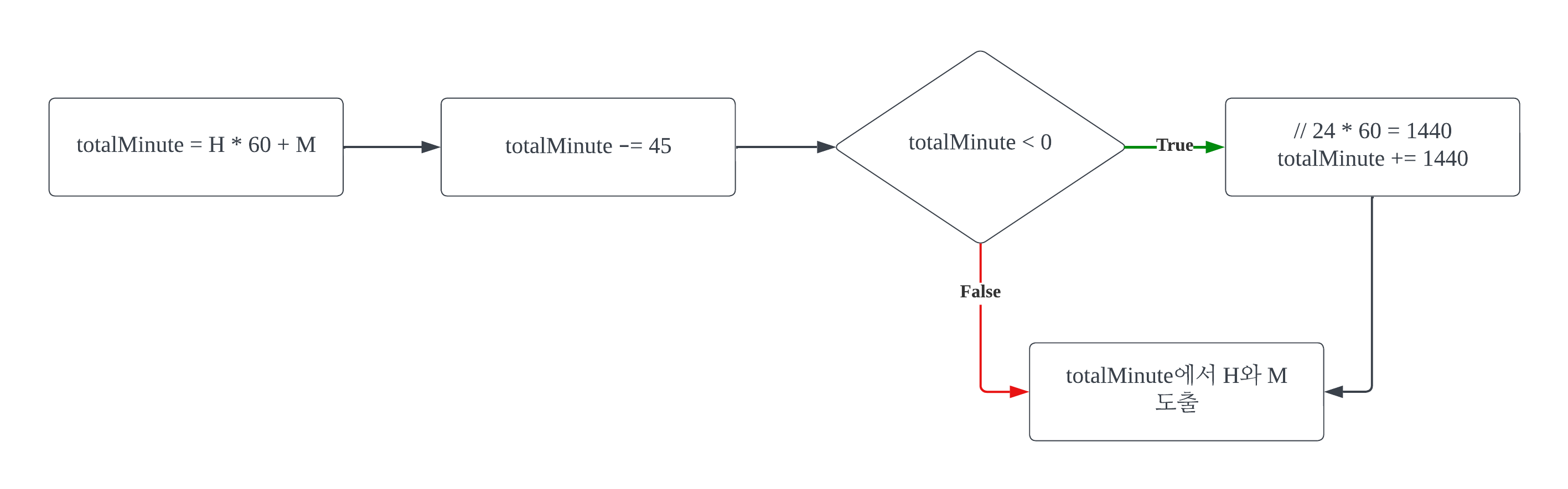 H의 최댓값이 23이고 M의 최댓값이 59라는 이유로, totalMinute < 0일 때, totalMinute += (23 * 60) + 59라고 적으면 안 된다. 23과 59은 표기상의 최댓값일 뿐, 실제 하루는 1440분이기 때문이다.