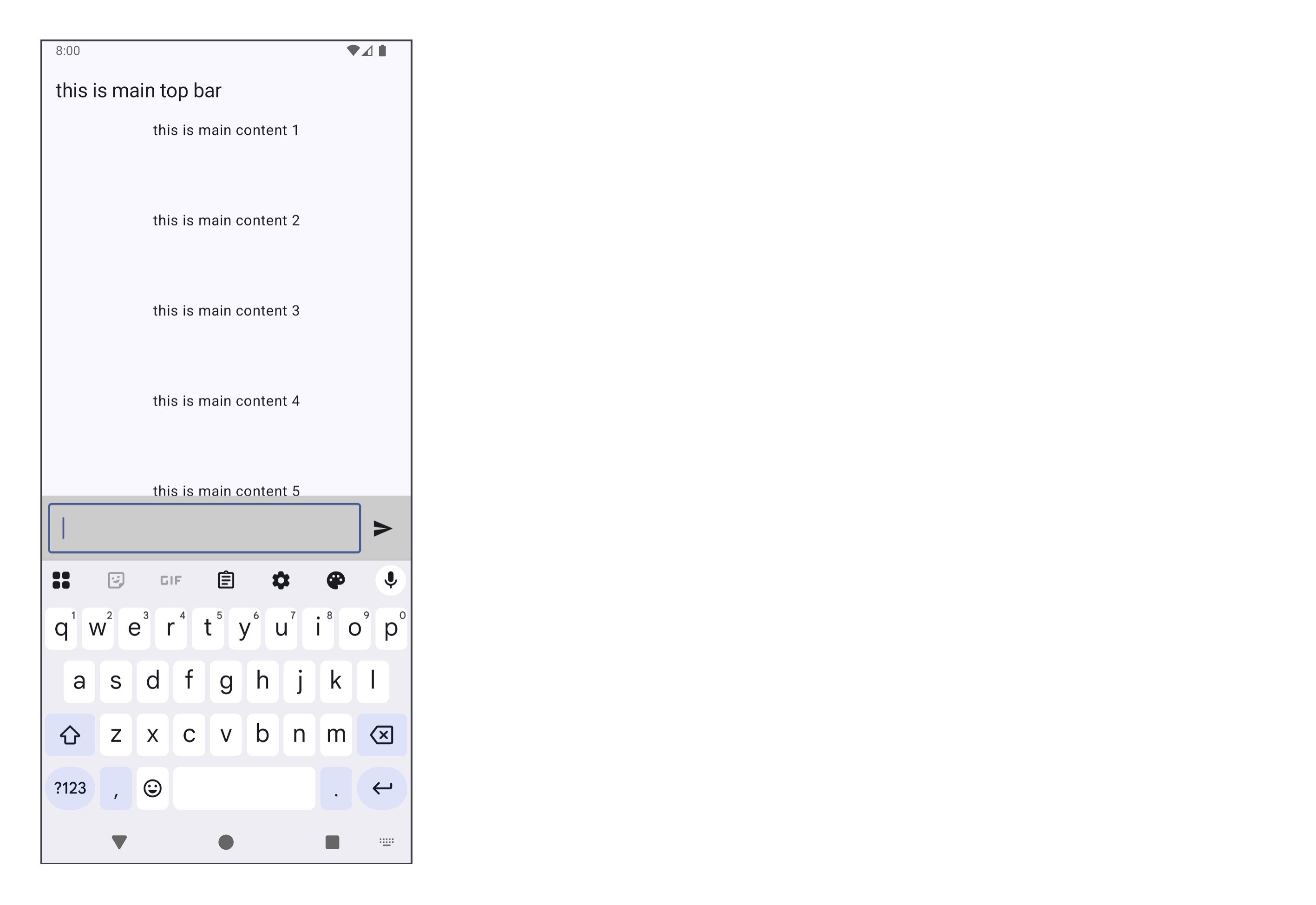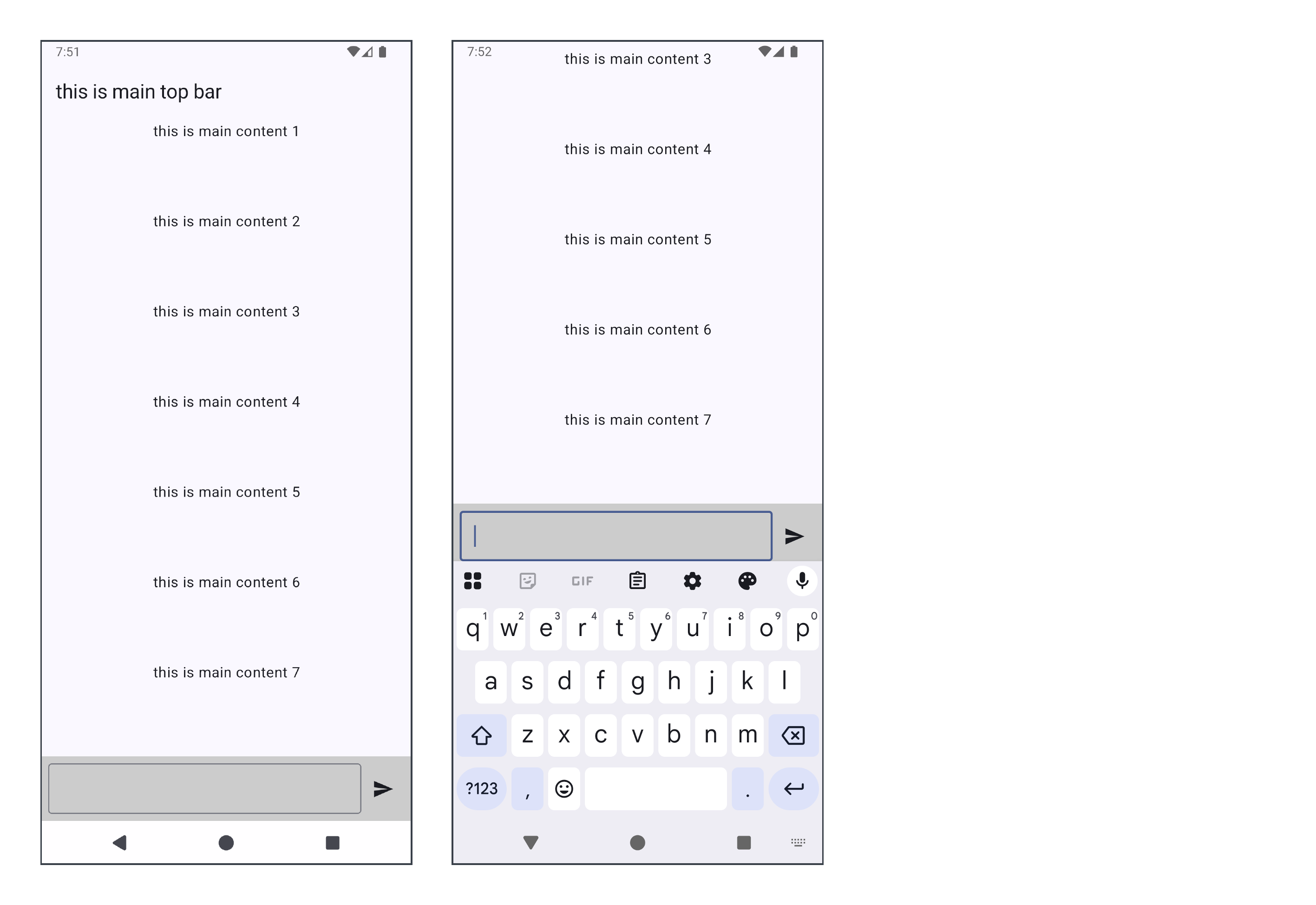 ๋ญ๊ฐ Compose Runtime๊ณผ ์กฐํ๋ฅผ ์ด๋ฃจ์ง ๋ชปํ๊ณ ์๋ค. #2-2์์ ๋ณธ ์์คํ ์ ์ผ๋ก ime๊ฐ TextField๋ฅผ ๋ฐ๊ณ ์ฌ๋ผ๊ฐ๋ ๋์๊ณผ์ ์ถฉ๋์ด ์ผ์ด๋ ๋ชจ์์๋ค. ์๋ํ๋ฉด topBar๊ฐ ๋ช ํ๋ ์ ๋์์ ์์คํ ์ฐฝ์ ๋ซ๊ณ ์ฌ๋ผ๊ฐ๊ธฐ ๋๋ฌธ์ด๋ค (ํจ๋ฉ์ ์ค์ ํ๋ ๊ฒ๋ง์ผ๋ก ๊ทธ๋ฐ ์ผ์ด ์ผ์ด๋ ์ ์๋ค). ์ด ๊ธฐ๋ณธ ๋์์ ์ปจํธ๋กคํด์ผ ๋ฌธ์ ๋ฅผ ํด๊ฒฐํ ์ ์์ ๊ฒ์ด๋ค.