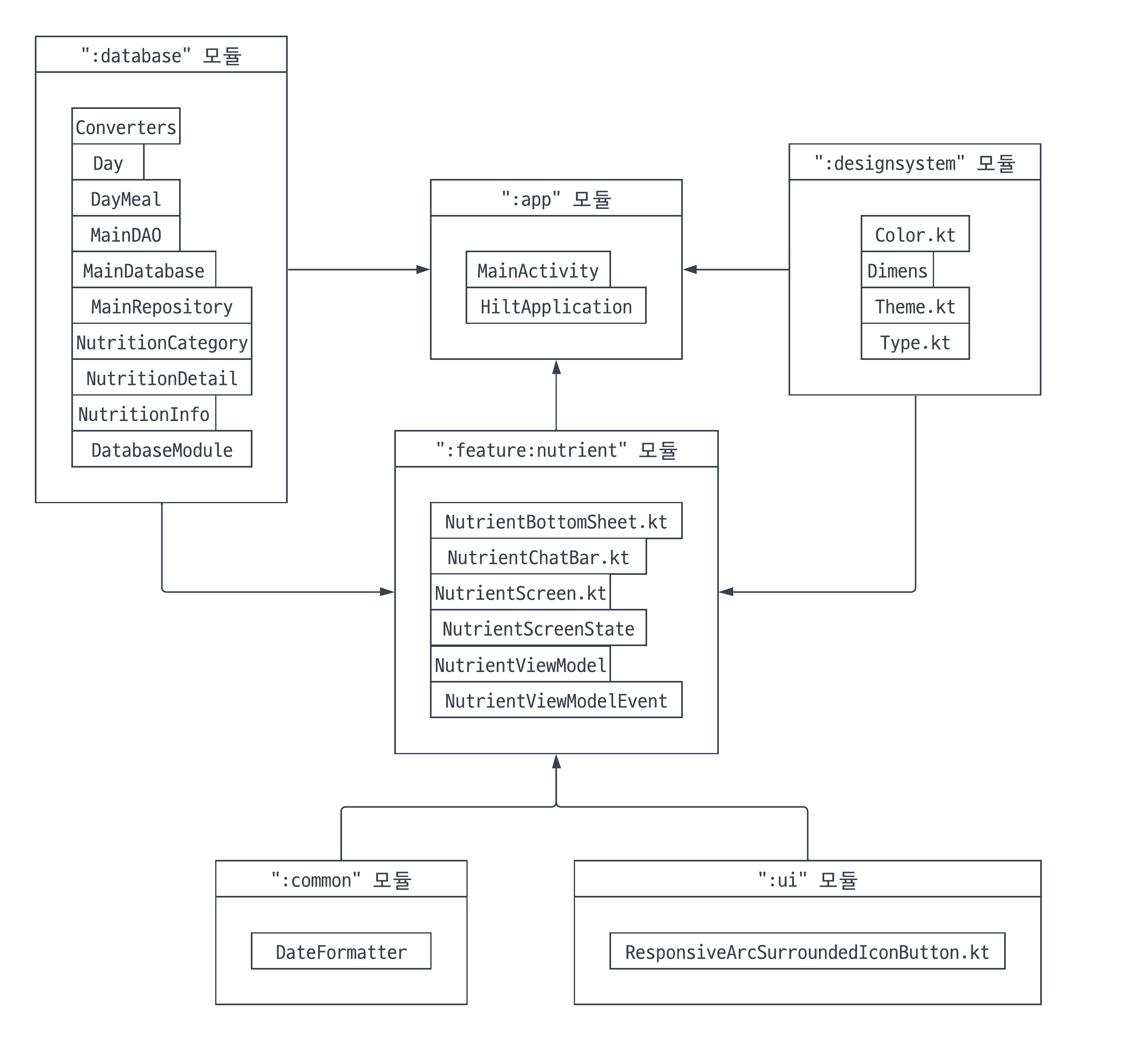 ๋ชจ๋์ ์ด๋ฆ, ๊ทธ๋ฆฌ๊ณ ๋ชจ๋ ์์ ํด๋์ค ๋๋ ํ์ผ์ ํํํ๋ค. ๋ชจ๋๋ผ๋ฆฌ๋ ์์กด์ฑ ๊ทธ๋ํ์ ๋ฐฉํฅ์ ๋ฐ๋ผ ํ์ดํ๋ก ์ฐ๊ฒฐํ๋ค. ๋ชจ๋์ ์ด๋ฆ์ Now in Android ํ๋ก์ ํธ์ ๋ชจ๋ ๋ช ์ ์ฐธ๊ณ ํ๋ค.