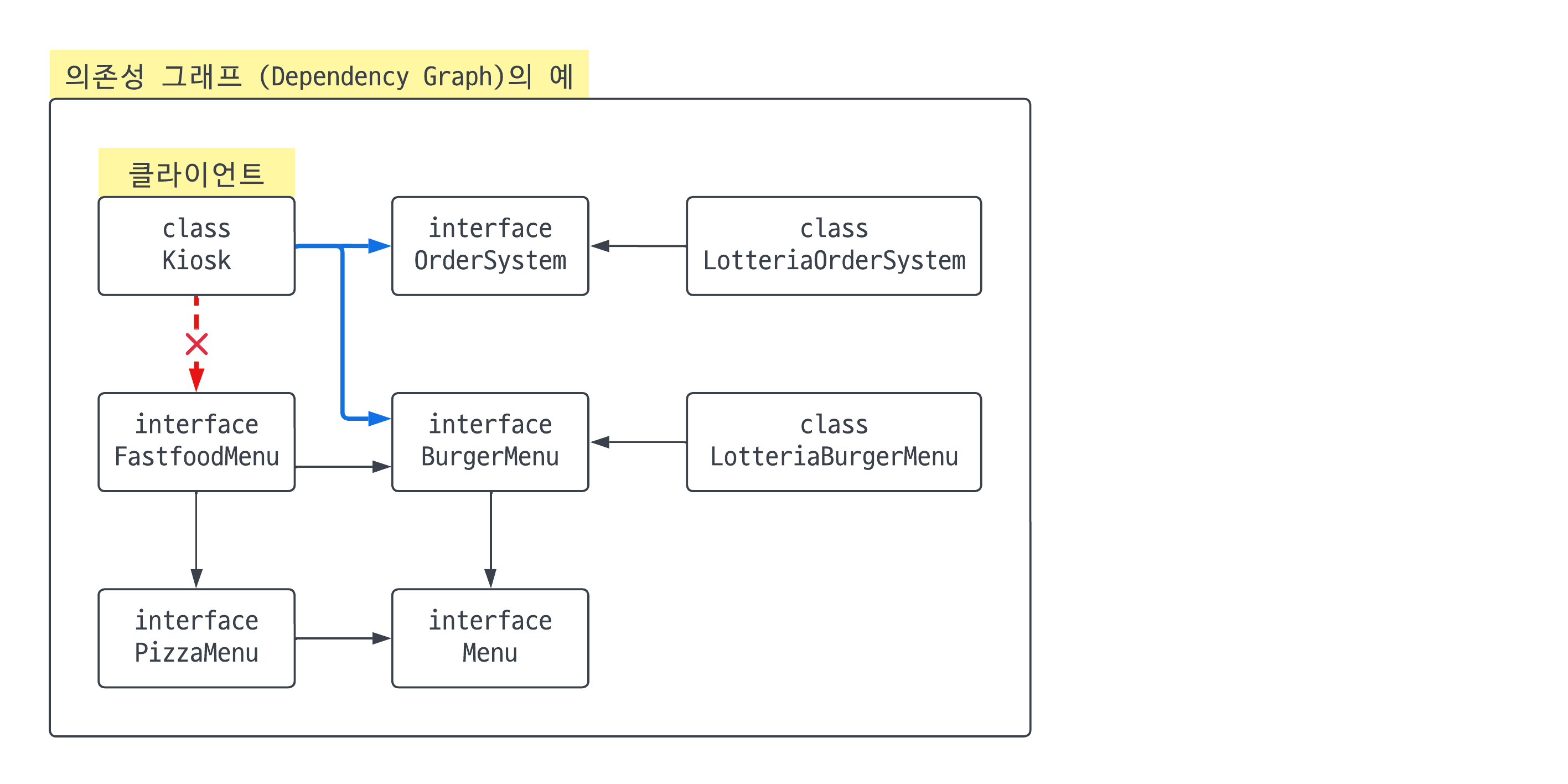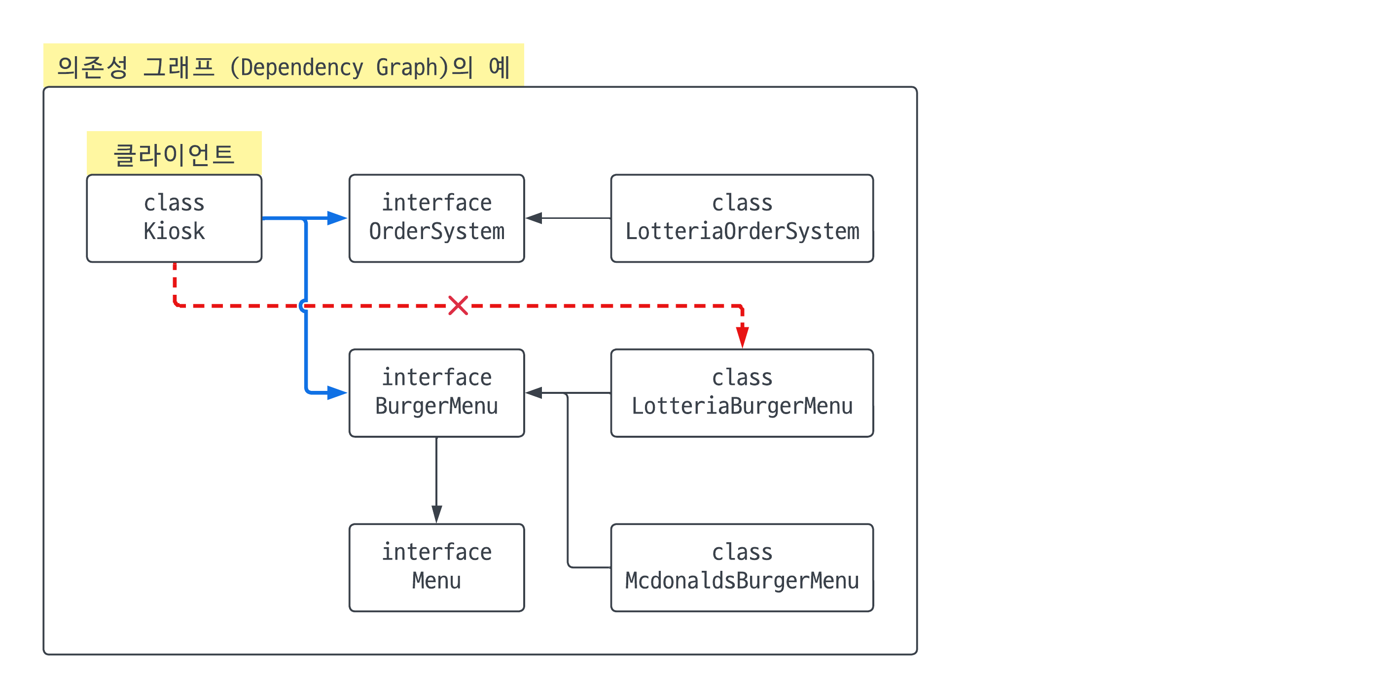 Kiosk๊ฐ LotteriaOrderSystem ๋ฐ LotteriaBurgerMenu ๋์ OrderSystem ๋ฐ BurgerMenu์ ์์กดํ๋ ์ด์ ๋ DIP ์์น์ ์งํค๊ธฐ ์ํจ์ด๋ค. ๋ง์ฝ Kiosk๊ฐ BurgerMenu๊ฐ ์๋ FastfoodMenu๋ฅผ ์์๋ฐ๋ ๊ตฌ์กฐ์๋ค๋ฉด(= ์์กดํ๋ค๋ฉด = implement ํ๋ค๋ฉด) ํผ์ ๋ฉ๋ด์ ๋ํด์ "์ฃผ๋ฌธํ ์ ์๋ ๋ฉ๋ด์ ๋๋ค."๋ฅผ ์ถ๋ ฅํ๋ ์ฝ๋๋ฅผ ์ผ์ผ์ด ๊ท์ฐฎ๊ฒ ๋ฃ์ด์ฃผ์ด์ผ ํ์ ๊ฒ์ด๋ค.