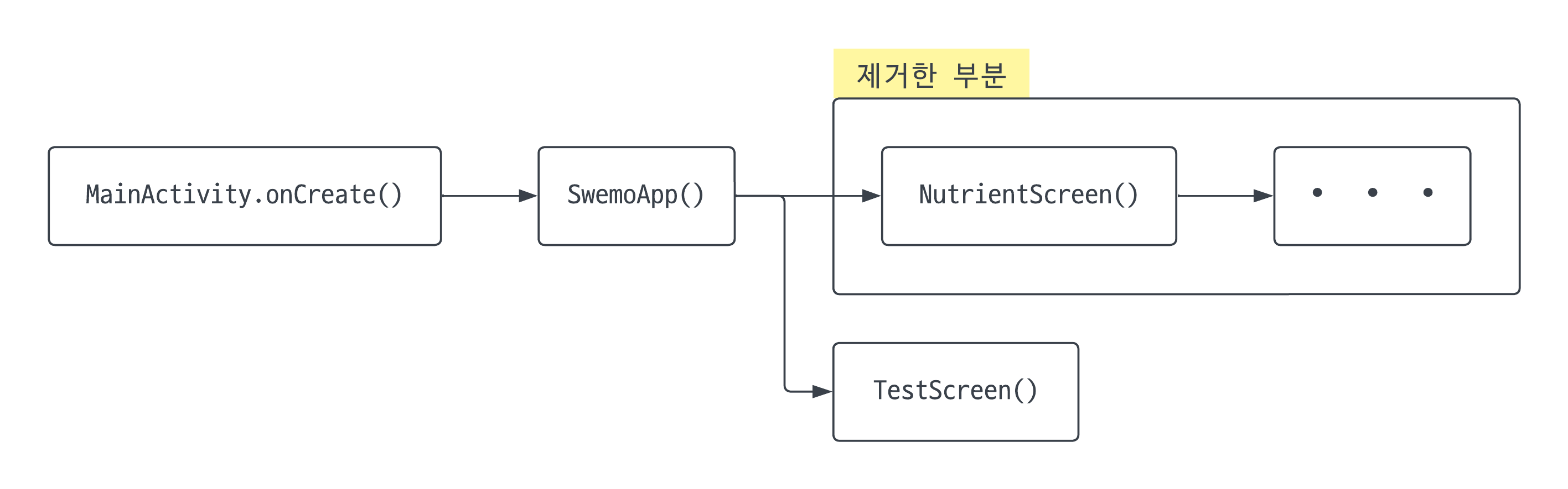 ์์กด์ฑ ๊ทธ๋ํ๋ค. NutrientScreen()์ ํธ์ถํ๋ ์๋ฆฌ์ TestScreen()์ ๋์ ๋๋ค. TestScreen()์ ์๋ฆฌ๋ง ์ฐจ์งํ๊ฒ ๋๋, ์์ ์ปดํฌ๋ํธ์ ์ญํ ์ด๋ค. ๊ทธ๋ฆฌ๊ณ ์ด ์ํ์์ ์ฑ ์คํ ๊ตฌ๋ ์ ์ฌ์ฉ๋์ง ์๋, '๊ฑฐ์' ๋ชจ๋ ์ฝ๋๋ฅผ ์ ๊ฑฐํ๋ค. "ํน์๋ผ๋ ๋์ค์ ์ธ ์๋ ์์ง ์์๊น?"๋ผ๋ ์๊ฐ์ด ๋๋ ์ฝ๋๋ ์ญ์ ํ๋, "์ด๊ฑด ๋จธ์ง์์ ๋ฐ๋์ ์ด๋ค"๋ผ๋ ์๊ฐ์ด ๋๋ ์ฝ๋๋ ๋จ๊ฒผ๋ค. ์ญ์ ํ ์ฝ๋ ์ค ์ถํ ์ ๋ง๋ก ํ์ํ ์ฝ๋๊ฐ ์๋ค๋ฉด, ๊ทธ๋ ๊ฐ์ ๋ค์ ์ถ๊ฐํ๋ค.
