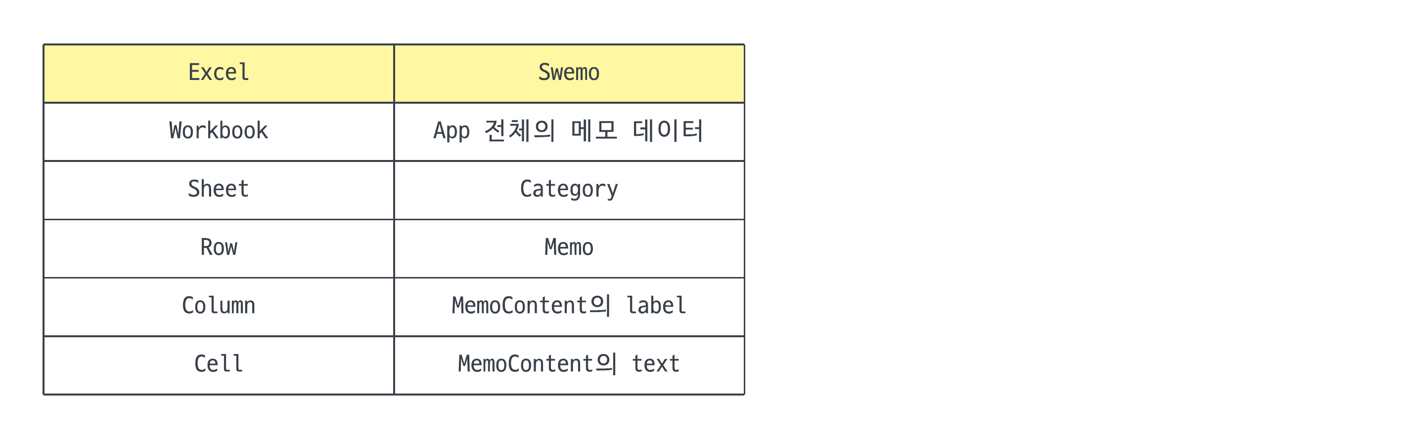 ์ด ์์ ์์์ ์ฐธ์กฐํ๋ฉด, ์๋์ ์๋ Excel ๋๋ฉ์ธ ๋ชจ๋ธ vs Swemo ๋๋ฉ์ธ ๋ชจ๋ธ ํ๋ฅผ ์ฝ๊ธฐ ํธํ ๊ฒ์ด๋ค.