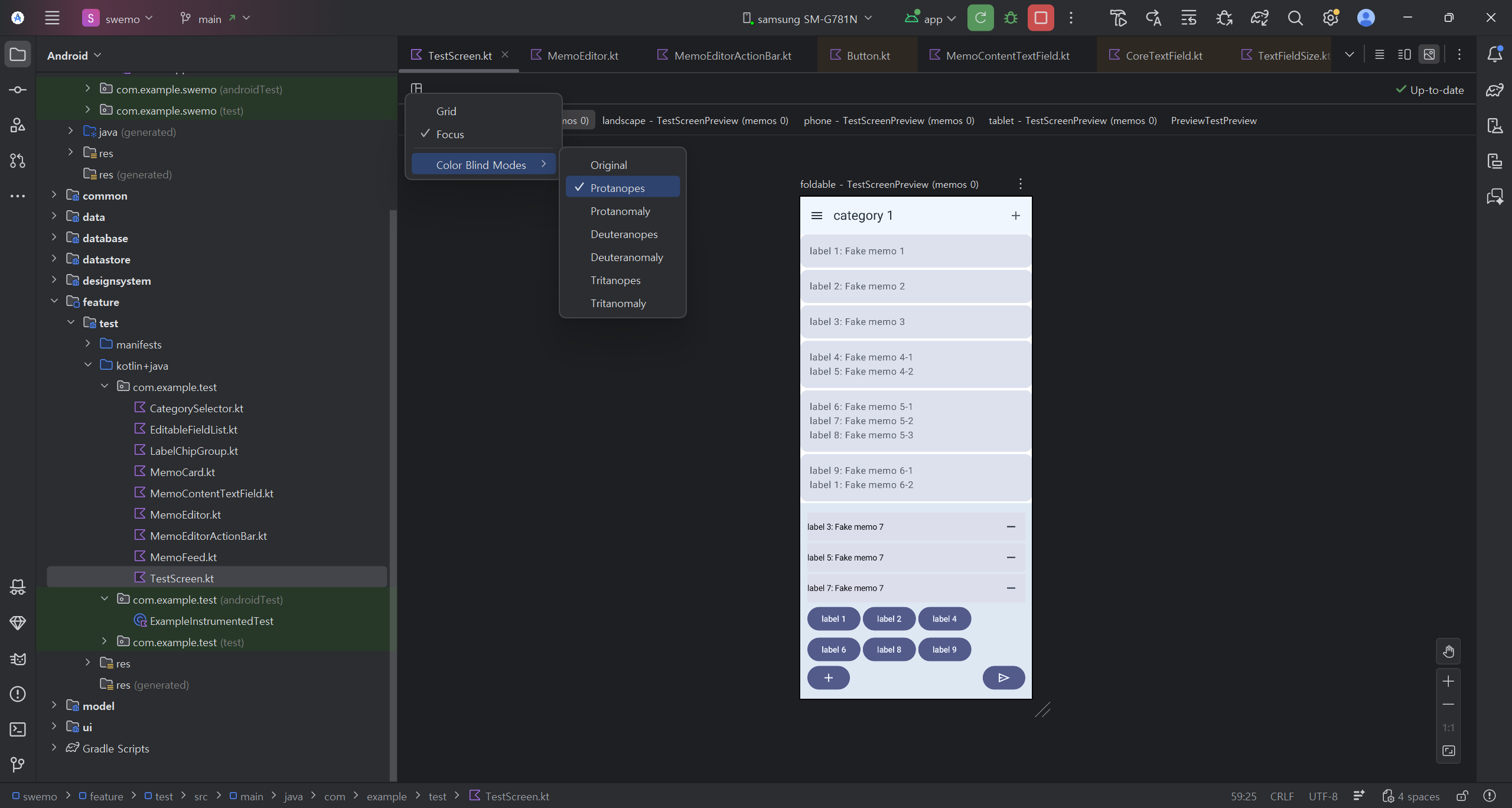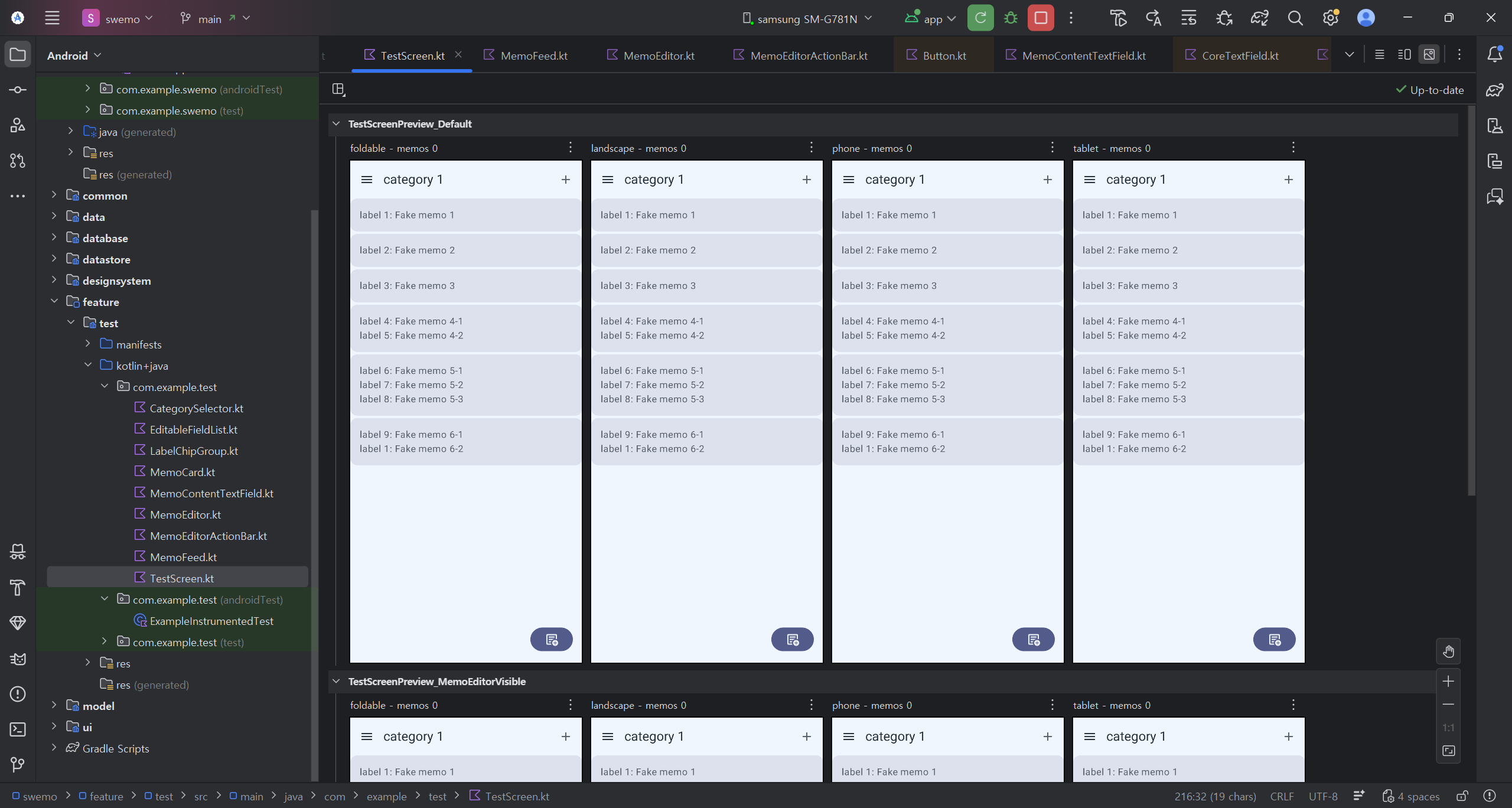 - ์์ UI๋ฅผ ๋ด๋นํ๋ TestScreen()์ ๋งค๊ฐ๋ณ์์ editingMemo: Memo ๋ฐ allLables: Set<Memo> ์ถ๊ฐ