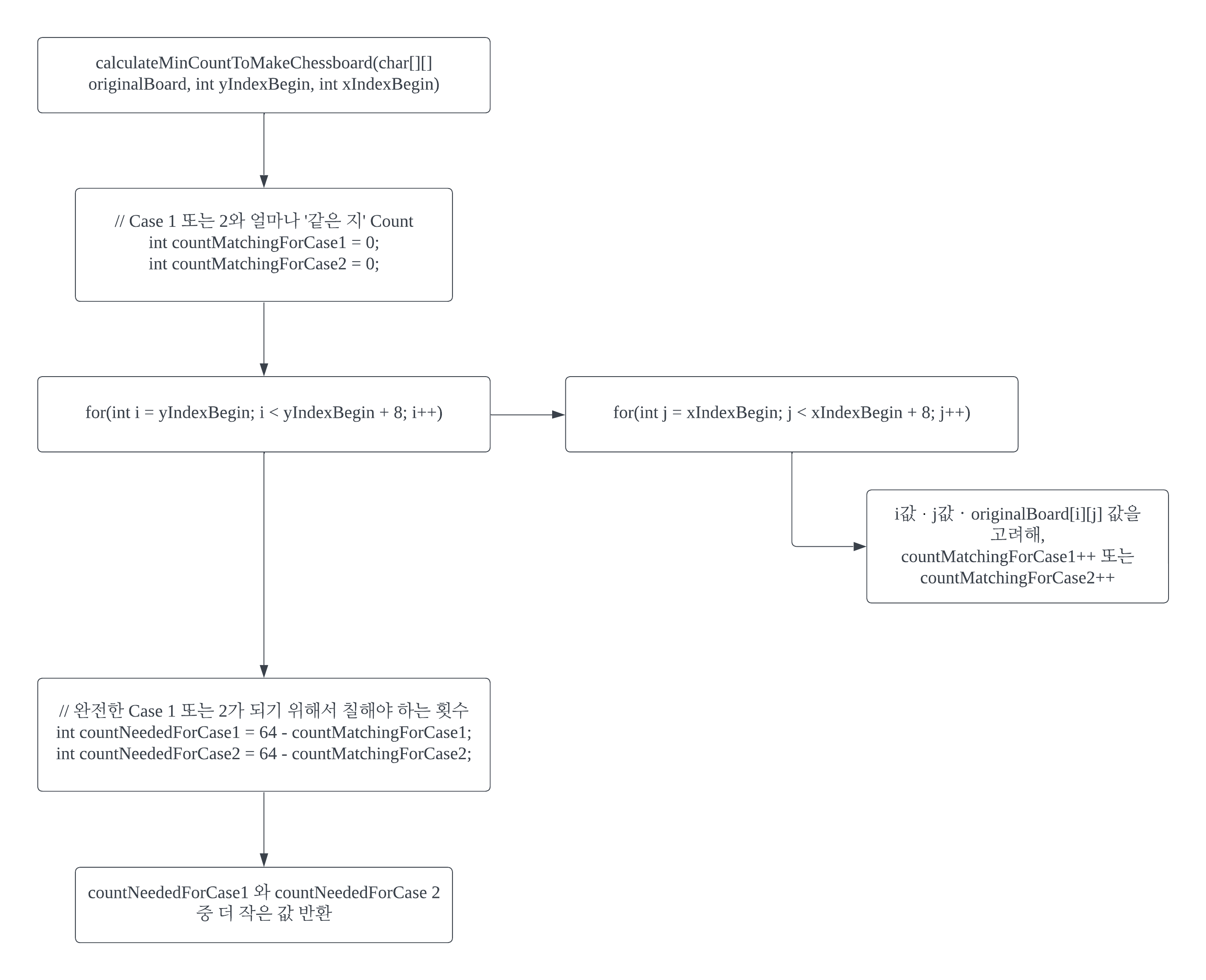 int currentCount = calculateMinCountToMakeChessboard(originalBoard, i, j);