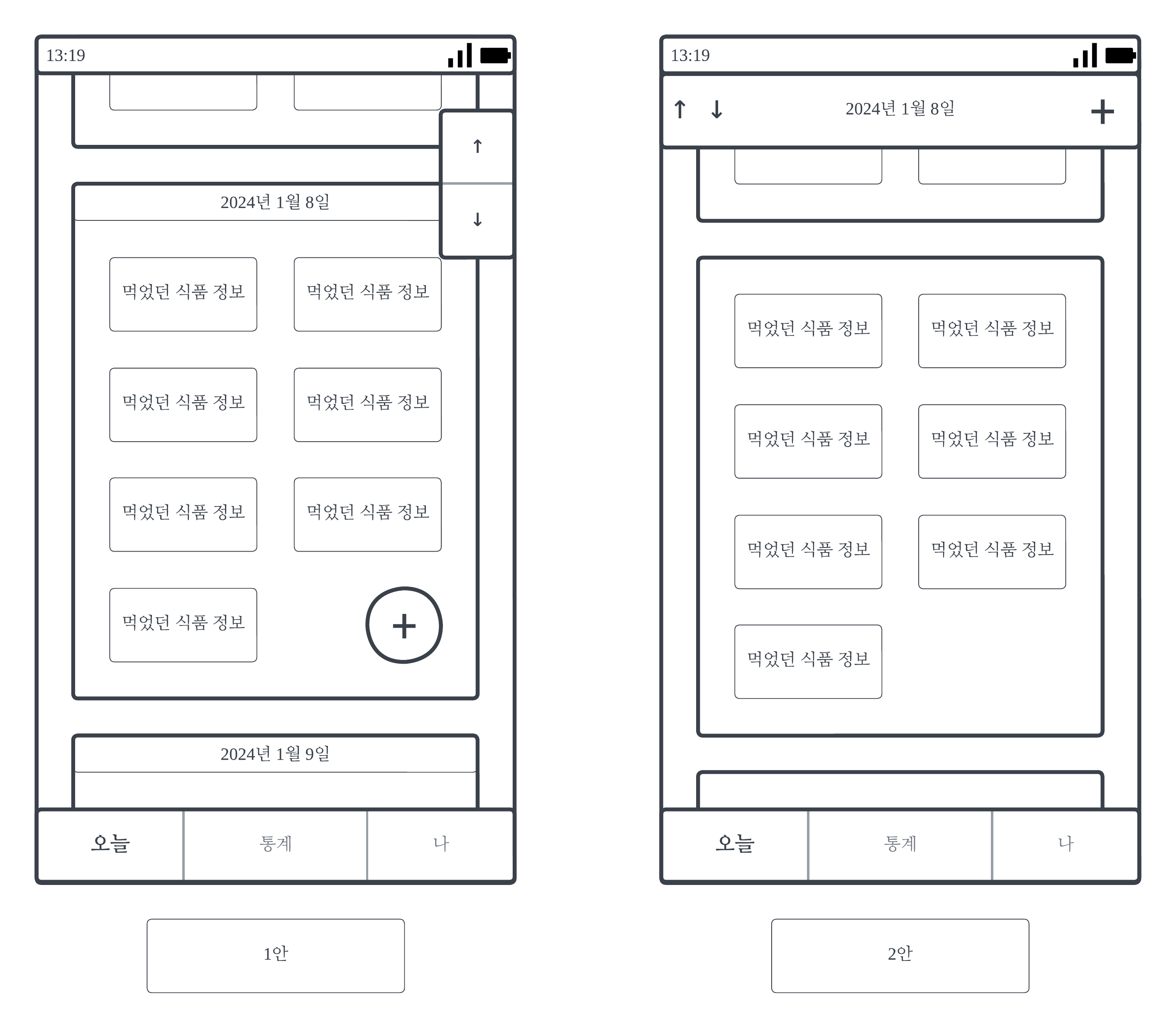 '์ค๋' ํ๋๊ทธ๋จผํธ๋, ๊ทธ ๋ ๋จน์ ์ํ์ ๋ํ ์ ๋ณด๋ฅผ ํ์ํ๋ค. + ๋ฒํผ์ ๋๋ฌ์ ์์ดํ ์ ์ถ๊ฐํ ์ ์๋ค.โจํ๋ฃจํ๋ฃจ์ ๋จ์๋ฅผ ๊ตฌ๋ถํ๋ Container๋ ViewPager2 ์์ ๋ด๊ธฐ๊ฒ ๊ตฌํํ๋ค. ๊ฐ Container๋ ์คํฌ๋กค๋ก๋ ์ด๋ํ ์ ์๊ณ , ↑ ๋๋ ↓ ๋ฒํผ์ผ๋ก๋ ๊ฐํธํ๊ฒ ์ด๋ํ ์ ์๋ค. ์ฒ์์ 1์์ ๊ตฌ์ํ์ผ๋, 2์๋ ๊ด์ฐฎ์๋ณด์ฌ์ ๋ ๋ค ์ ๋ก๋ํ๋ค. 2์์ผ๋ก ๊ฐ ๊ฒ ๊ฐ๋ค. ์ ๋ณ๋ก๋ฉด 1์ ๋๋ ์์ ์๋ก์ด ๋์์ธ์ ์๋ํด๋ณด๊ฒ ๋ค.