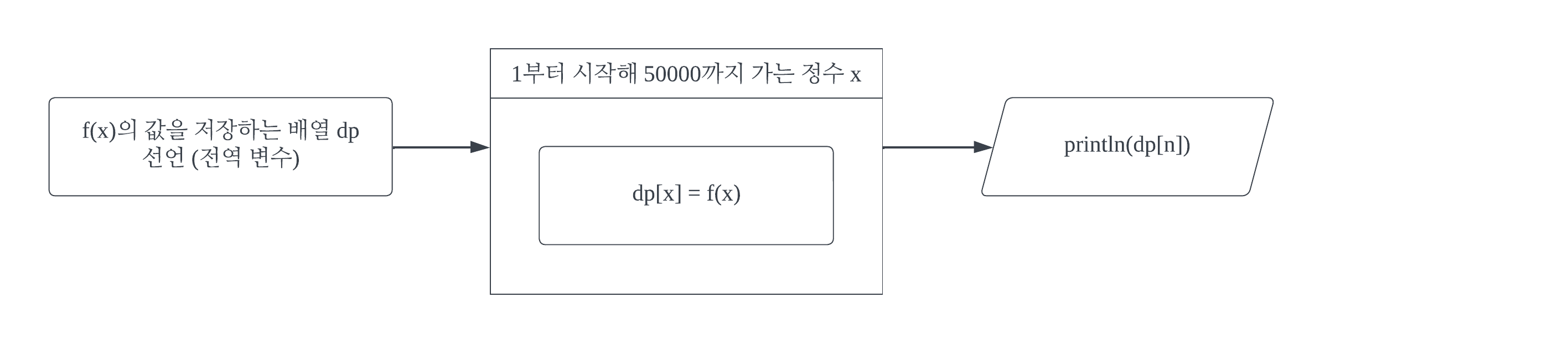 동적 프로그래밍에서의 '작은 문제'를 저장하기 위한 배열 dp을 선언하고, f(x)의 해를 dp[x]에 저장해나간다.