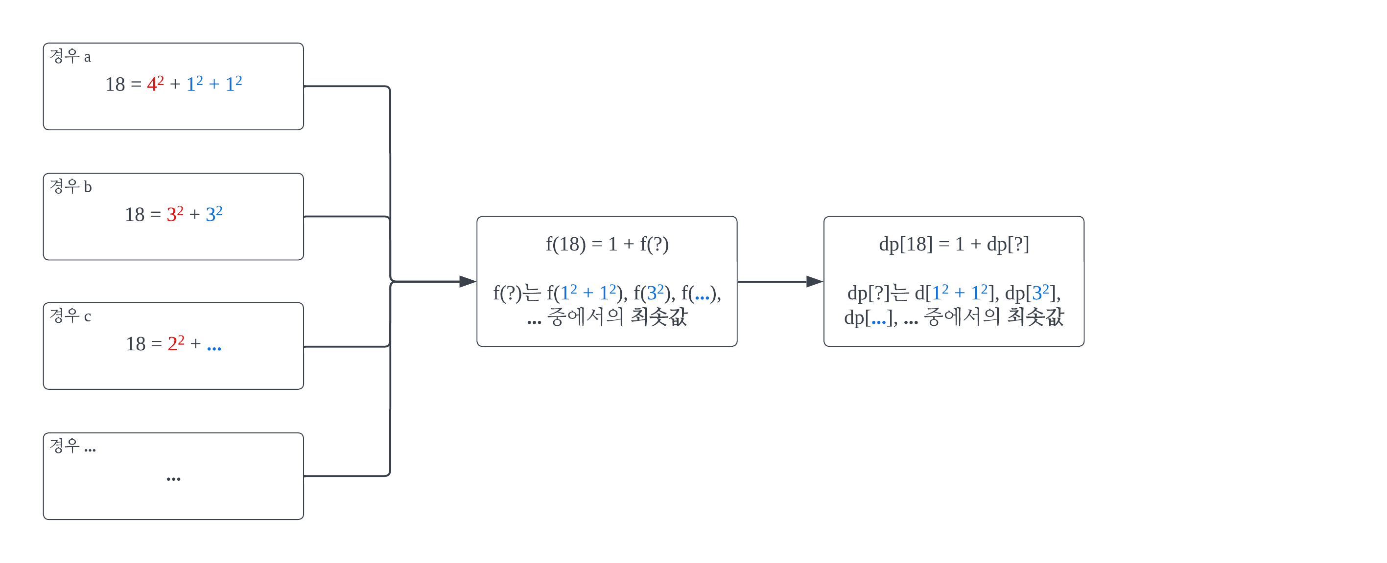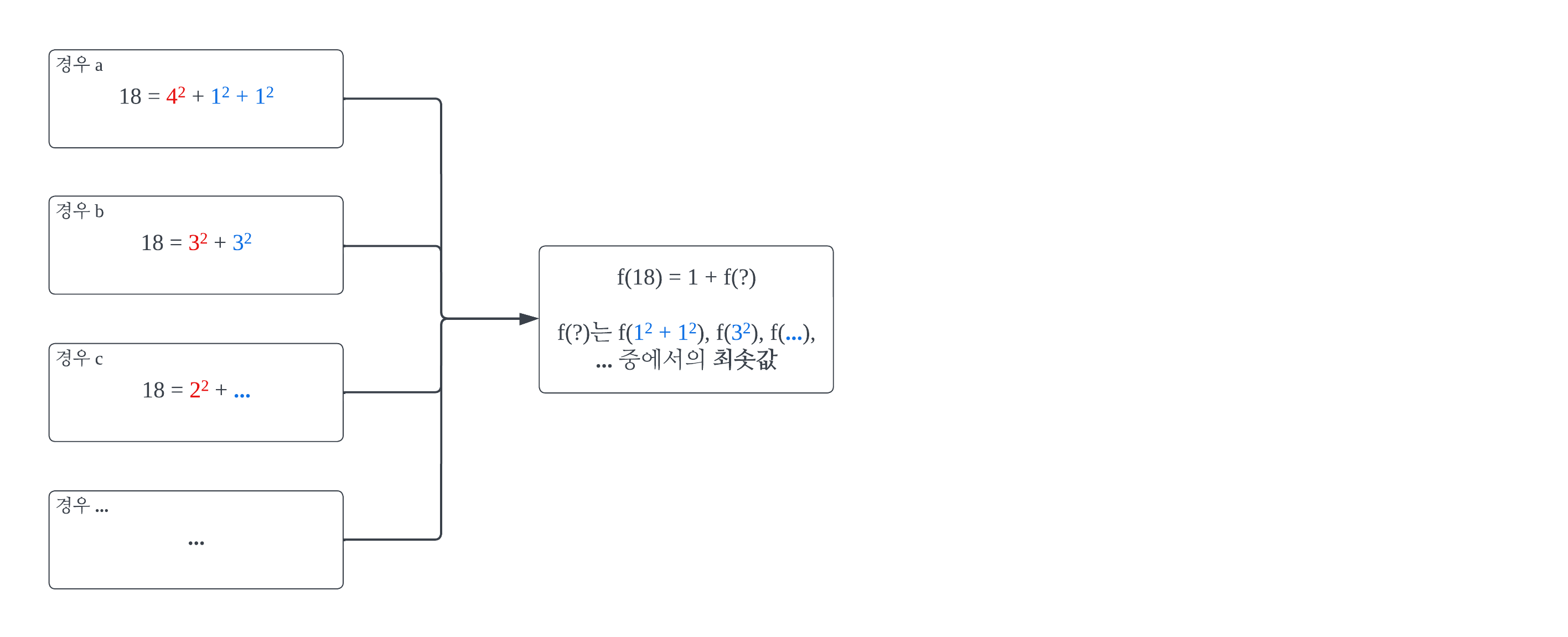 x의 제곱수 합의 최소 갯수를 반환하는 함수 f(x)를 가정한다. 이러면, a와 b 각각의 42와 32를 f(x)에 넣으면 f(42) = 1이고 f(32) = 1이다. 즉, 모든 빨간 부분은 f(x)에 넣으면 1로 그 값이 같다. 여기에서 f(x) = 1 + f(y)라는 식을 도출할 수 있다. y값은 a의 경우 18 - 42, b의 경우 18 - 32, c의 경우 18 - 22다. 이를 일반화하면 f(x) = 1 + f(x - i2)다. i의 범위는 1 ~ (x의 제곱근을 넘지 않는 정수의 최댓값)인 정수다. 결론적으로, f(x)는 재귀 함수다.
