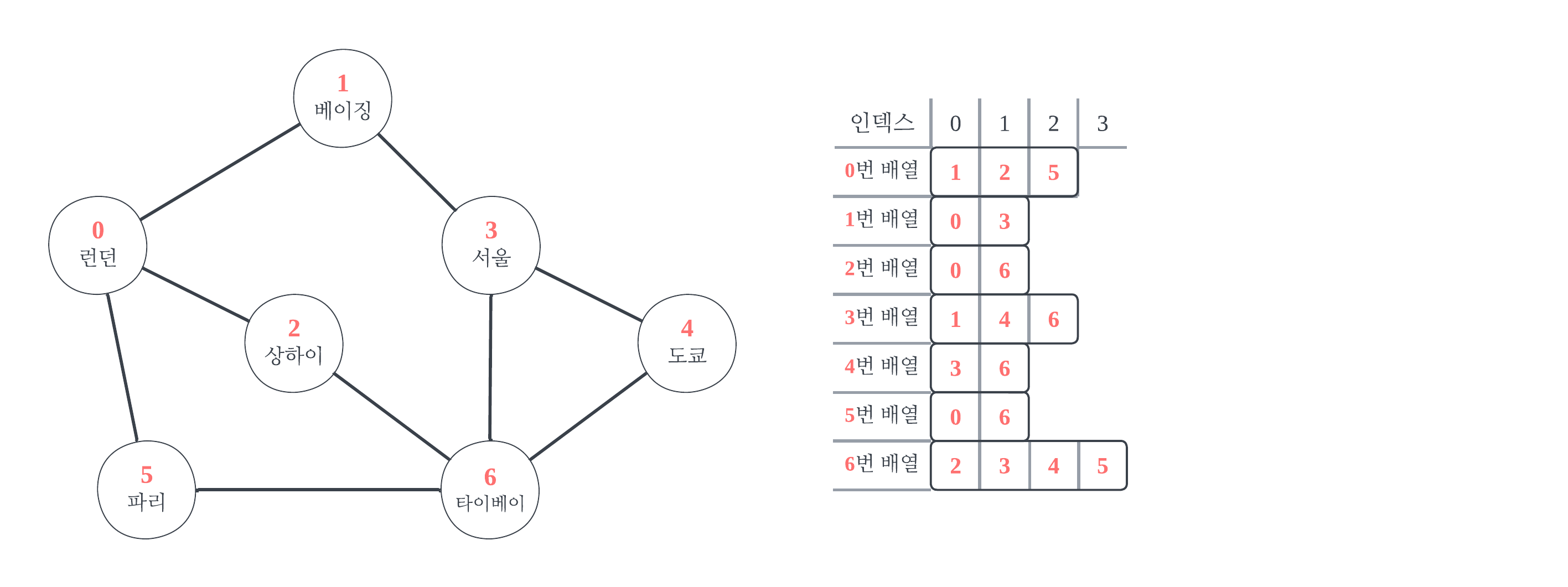 λ°°μ΄λ‘λ κ·Έλνλ₯Ό ννν μ μλ€. λ¨Όμ , μ μ μ κ°―μλ§νΌ λ°°μ΄μ μ μΈνλ€. κ° λ°°μ΄μ 0λ² μμμλ ν΄λΉ μ μ κ³Ό μ°κ²°λ κ°μ (≠μ μ )μ κ°―μλ₯Ό ν λΉνλ€ (#3-3μ TMIμμ μΆκ° μ€λͺ