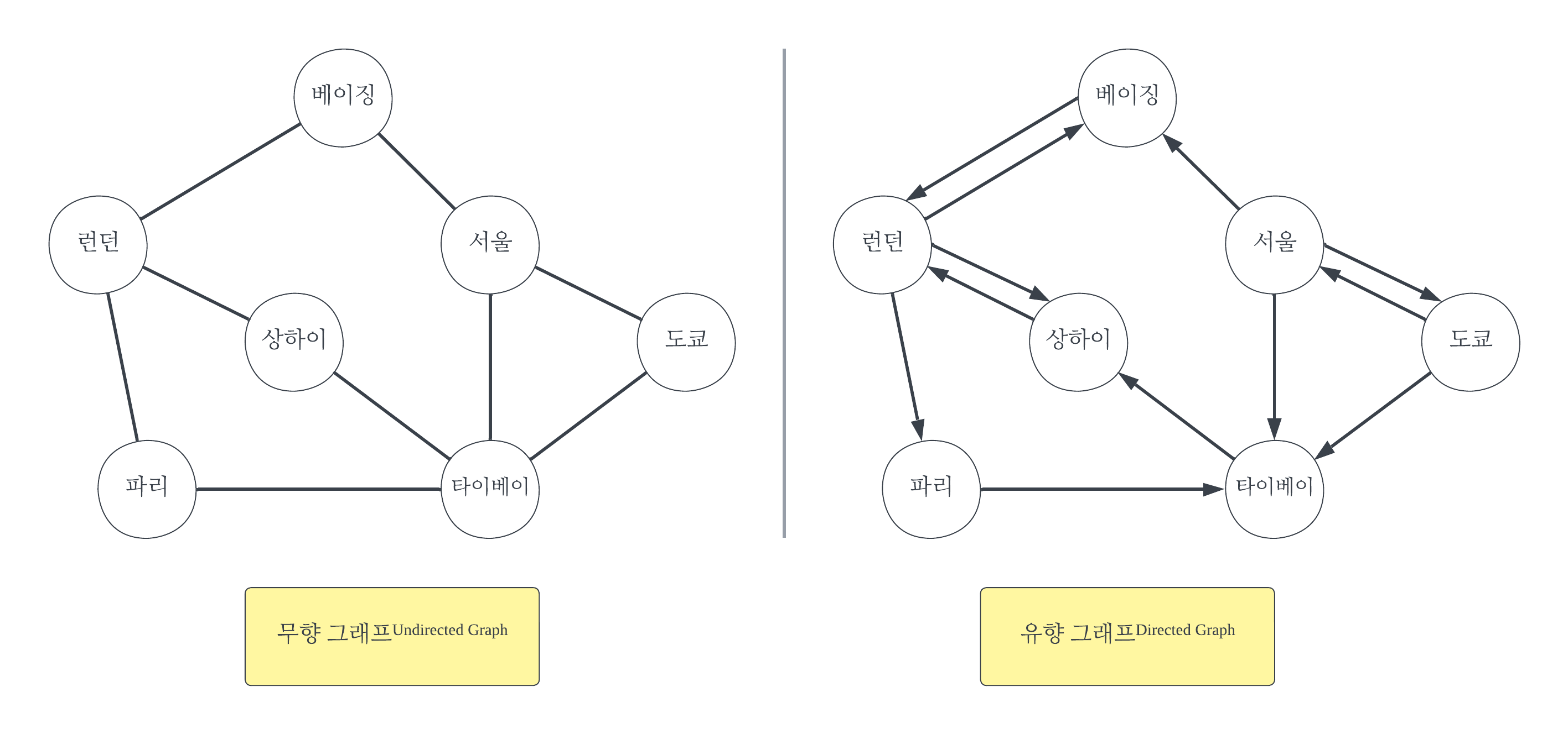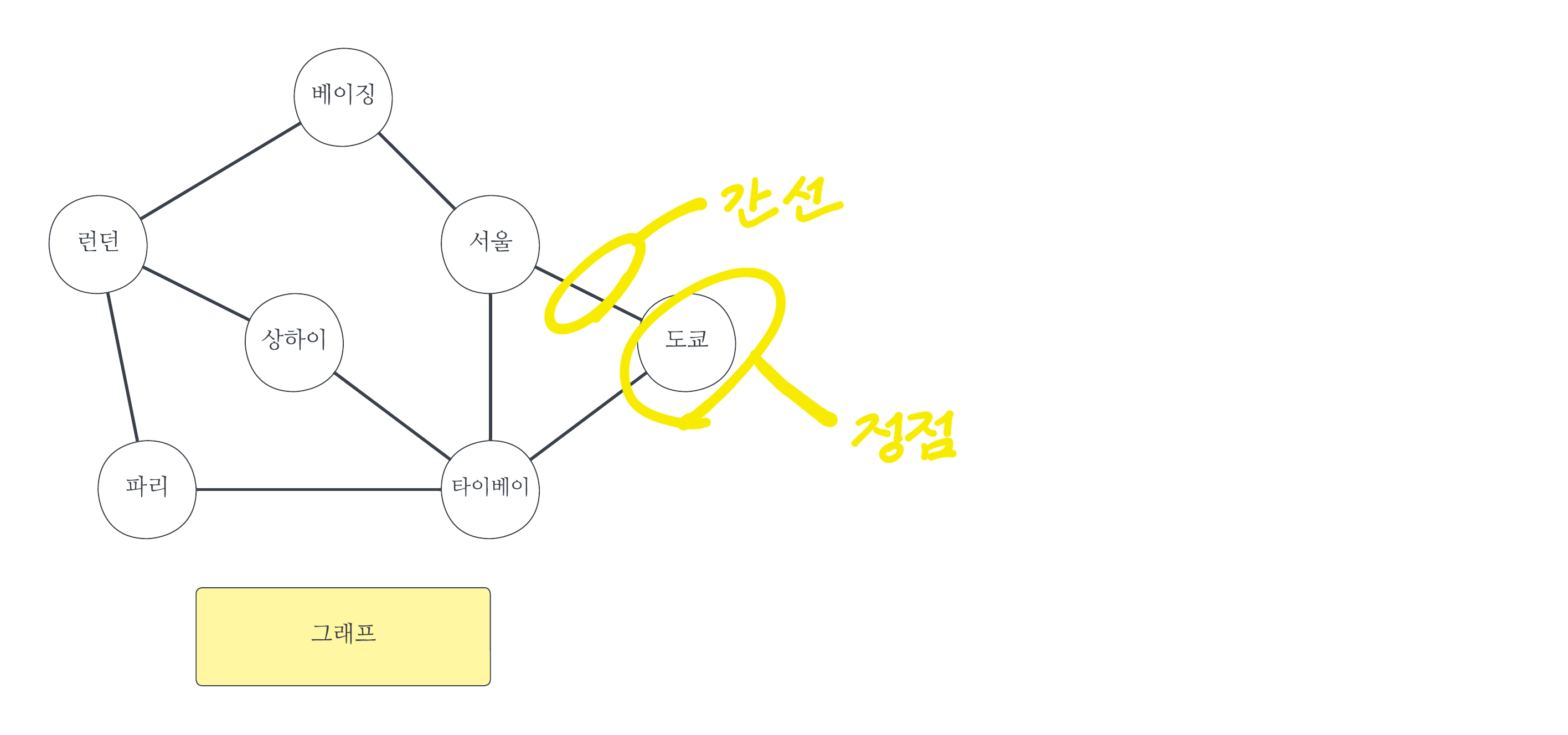 κ·Έλνλ νμμ΄λ μ¬λ¬Όμ μ μ (Vertex)μ κ°μ (Edge)λ‘ νννλ κ²μ΄λ€. μ μ μ μ΄λ€ κ°μ²΄λ₯Ό λνλ΄κ³ , κ°μ μ κ·Έ κ°μ²΄λ€ κ°μ κ΄κ³λ₯Ό λνλΈλ€. μ κ·Έλ¦Όμ κ° μ μ (λμ)μ ν곡νΈ(κ°μ )μ΄ μλ λͺ¨μ΅μ ννν μμ΄λ€. nκ°μ μ μ μ§ν© Vμ μ΄λ€ κ°μ μ‘΄μ¬νλ κ°μ μ μ§ν© Eλ‘ κ΅¬μ±λ κ·Έλν Gλ₯Ό G = (V, E)λ‘ κΈ°μ νλ€.