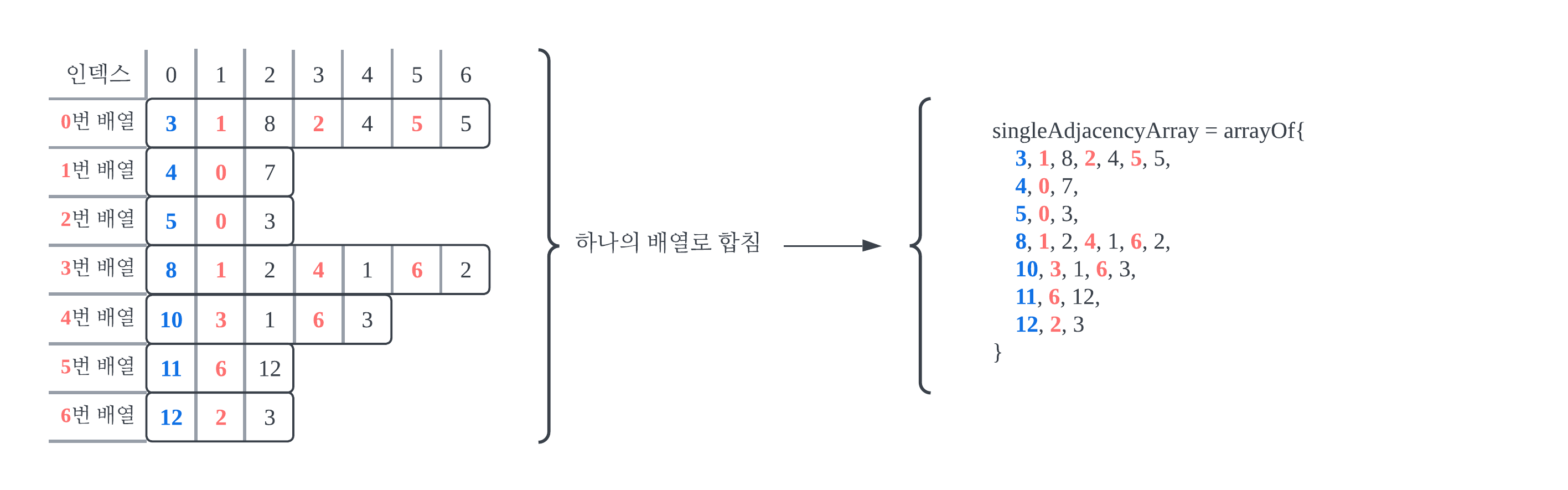 #3-3μ 0 ~ 6λ² λ°°μ΄μ νλλ‘ ν©μΉ μλ μλ€. #3-3μμ μΈλ±μ€ 0μ ν΄λΉνλ λΆλΆμ νλ κΈμ¨μ²λΌ λ°κΎΌλ€. νλ κΈμ¨μ μλ―Έλ νμ¬ λ°°μ΄κΉμ§ ν¬ν¨ν΄ λμ λ μ μ μ κ°―μλ€. κ·Έλ¦¬κ³ λͺ¨λ λ°°μ΄μ νλλ‘ ν©μ³ singleAdjacencyArrayλ₯Ό λ§λ λ€. ν΄λΉ λ°°μ΄μμ μ΄λ€ μ μ λλ κ°μ μ μ°Έμ‘°νλ λ‘μ§μ λ§μ΄ 볡μ‘νκ² μ§λ§, μ΄λ€ κ·Έλνλ₯Ό νλμ λ°°μ΄λ‘ λ³νν μ μλ€λ κ²μ λΆλͺ ν μ₯μ μ΄λ€.