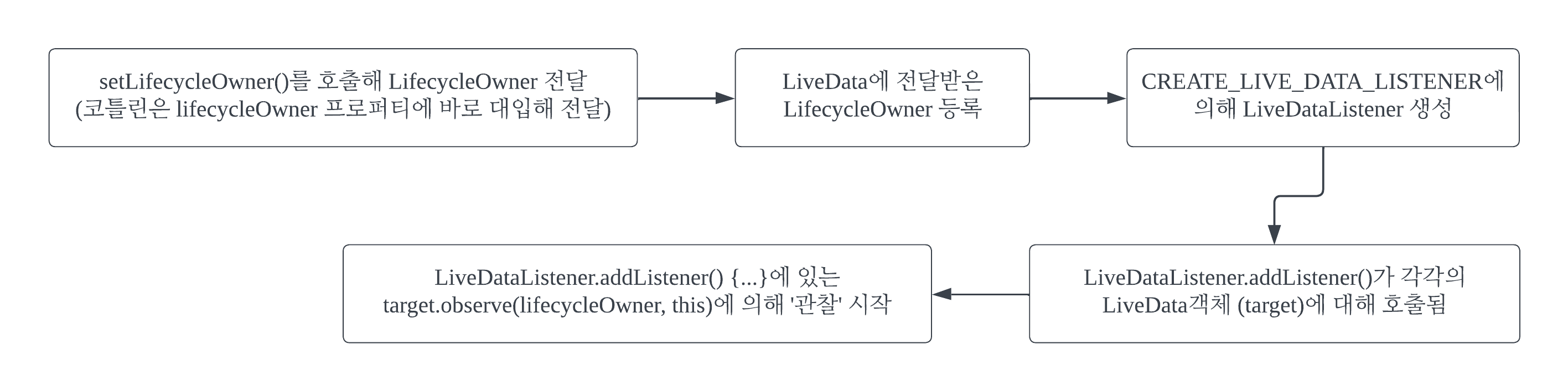 setLifecycleOwner์ ์ฃผ์์ ๋ณด๋ฉด, public ๋ฉ์๋์ธ setLifecycleOwner()๋ก ViewDataBinding ๊ฐ์ฒด์ LifecycleOwner๋ฅผ ๋ฑ๋กํด์ฃผ์ด์ผ ๋น๋ก์ LiveData์ '๊ด์ฐฐ(observe)'์ด ์์๋๋ค๊ณ ํ๋ค. ์ฆ LiveData.observe()๊ฐ ์์์ ์ผ๋ก ์ํ๋๋ค๋ ์๊ธฐ๋ค. ๊ทธ ์ ์ฒด์ ์ธ ํ๋ฆ์ ๋ค์๊ณผ ๊ฐ๋ค.