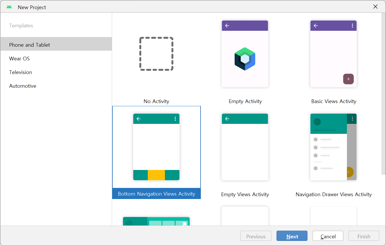 [File] โ [New] โ [New Project...] โ [Bottom Navigation Views Activity]์ ํ