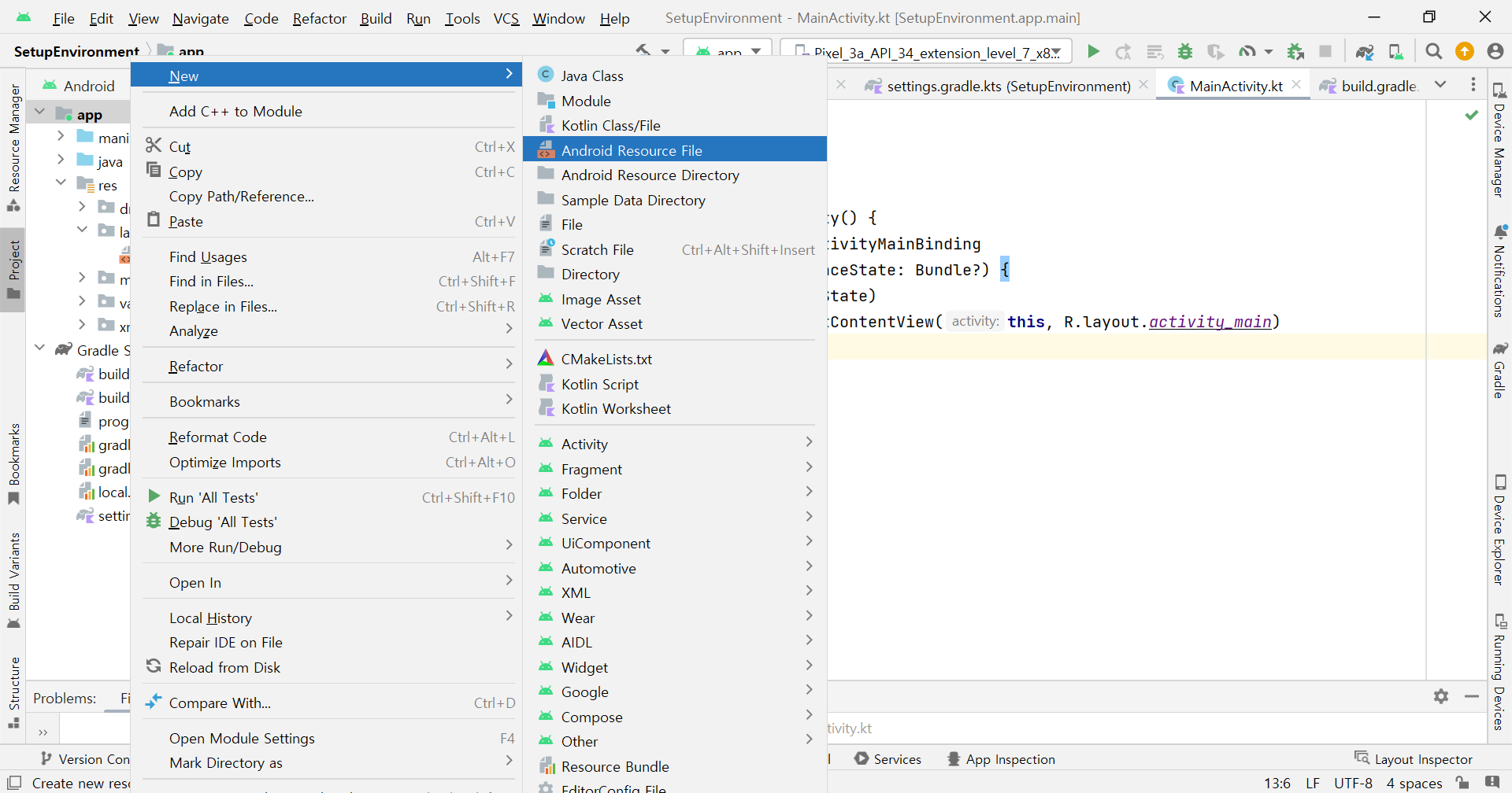 ๋ชจ๋์ ์ด๋ฆ(์ฌ๊ธฐ์๋ "app")์ ์ฐํด๋ฆญํ๋ฉด ๋์ค๋ ๋ฉ๋ด์์ [New] - [Android Resource File]์ ํด๋ฆญํ๋ค.