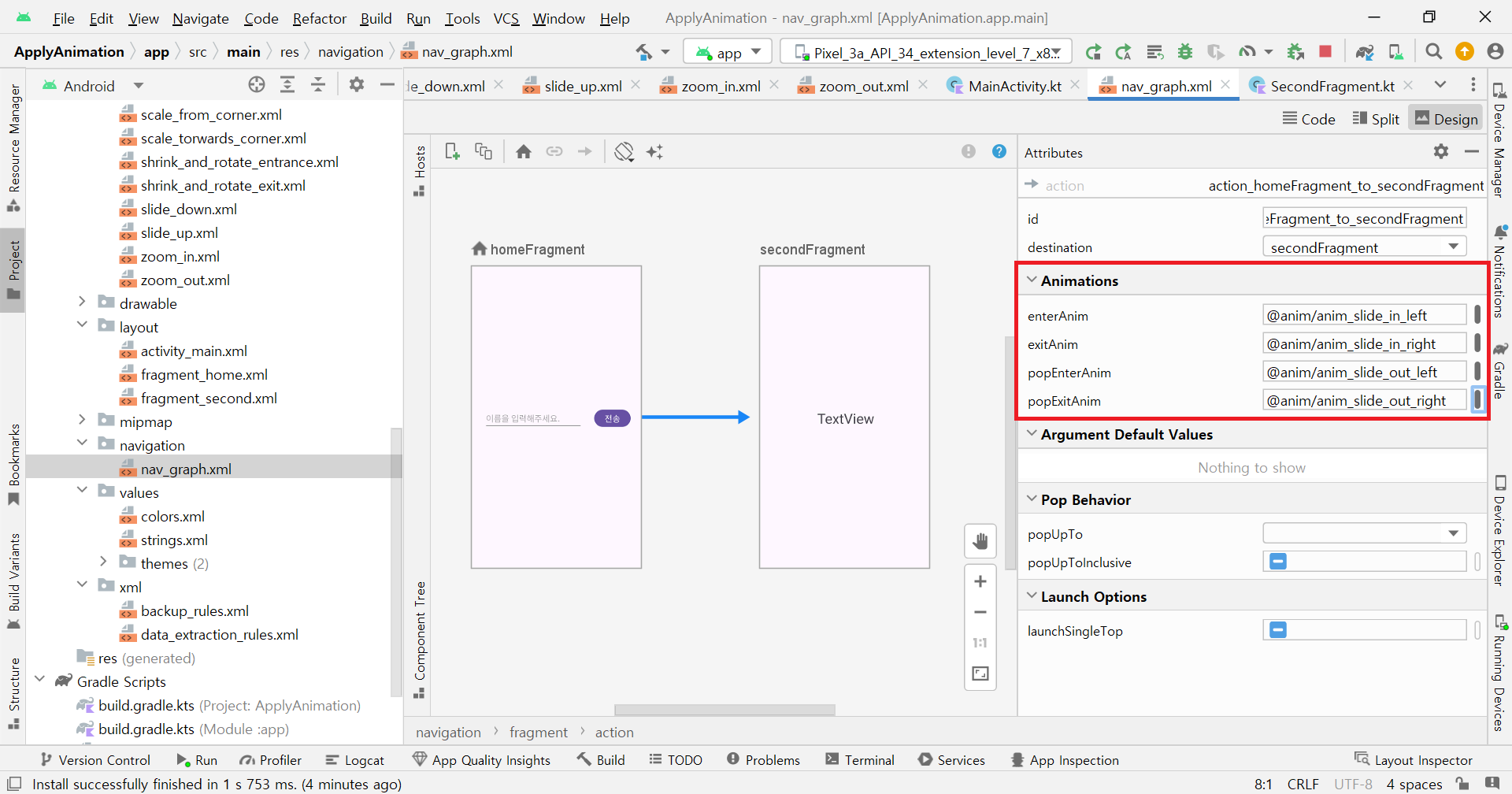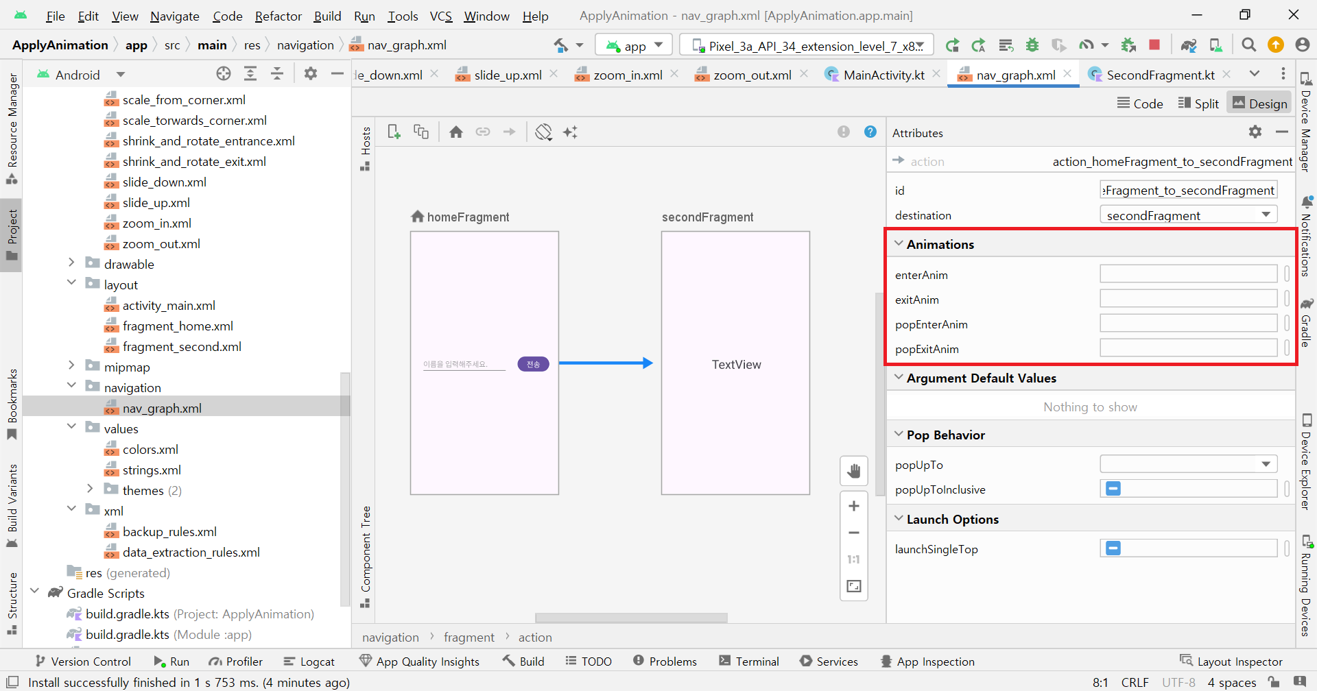 Navigation graph๋ฅผ Design ๋ชจ๋๋ก ์ฐ๋ค. ๊ทธ๋ฆฌ๊ณ Action์ ํด๋ฆญํ๋ฉด Animation์ด๋ผ๋ ์์ฑ์ ๊ฐ์ง๊ณ ์์์ด ๋ณด์ธ๋ค. ์ฆ, ํ๋๊ทธ๋จผํธ์ ์ ํ ์ ๋๋ฉ์ด์ ์ Action์ด ๊ด๋ฆฌํ๋ค๋ ์๊ธฐ๋ค. ์ด 4๊ฐ์ ์์ฑ์ด ์์ผ๋ฉฐ ๊ฐ๊ฐ์ ๋์ ์๊ธฐ๋ ๋ค์๊ณผ ๊ฐ๋ค.