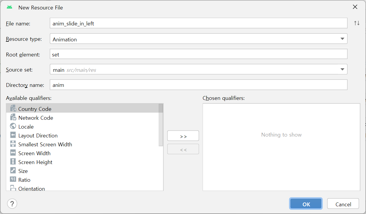 ์ด๋ฆ์๋ anim_slide_in_left์ ๊ฐ์ด ์คํ์ค๋ฒํ๋ก์ฐ ์ฌ์ดํธ์ ์๋ ํ์ผ์ ์ด๋ฆ์ ๊ทธ๋๋ก ๋ณต์ฌํด ๋ถ์ฌ๋ฃ๋๋ค. Resource type์ Animation์ผ๋ก ์ค์ ํ๊ณ , OK ๋ฒํผ์ ๋๋ฅธ๋ค.