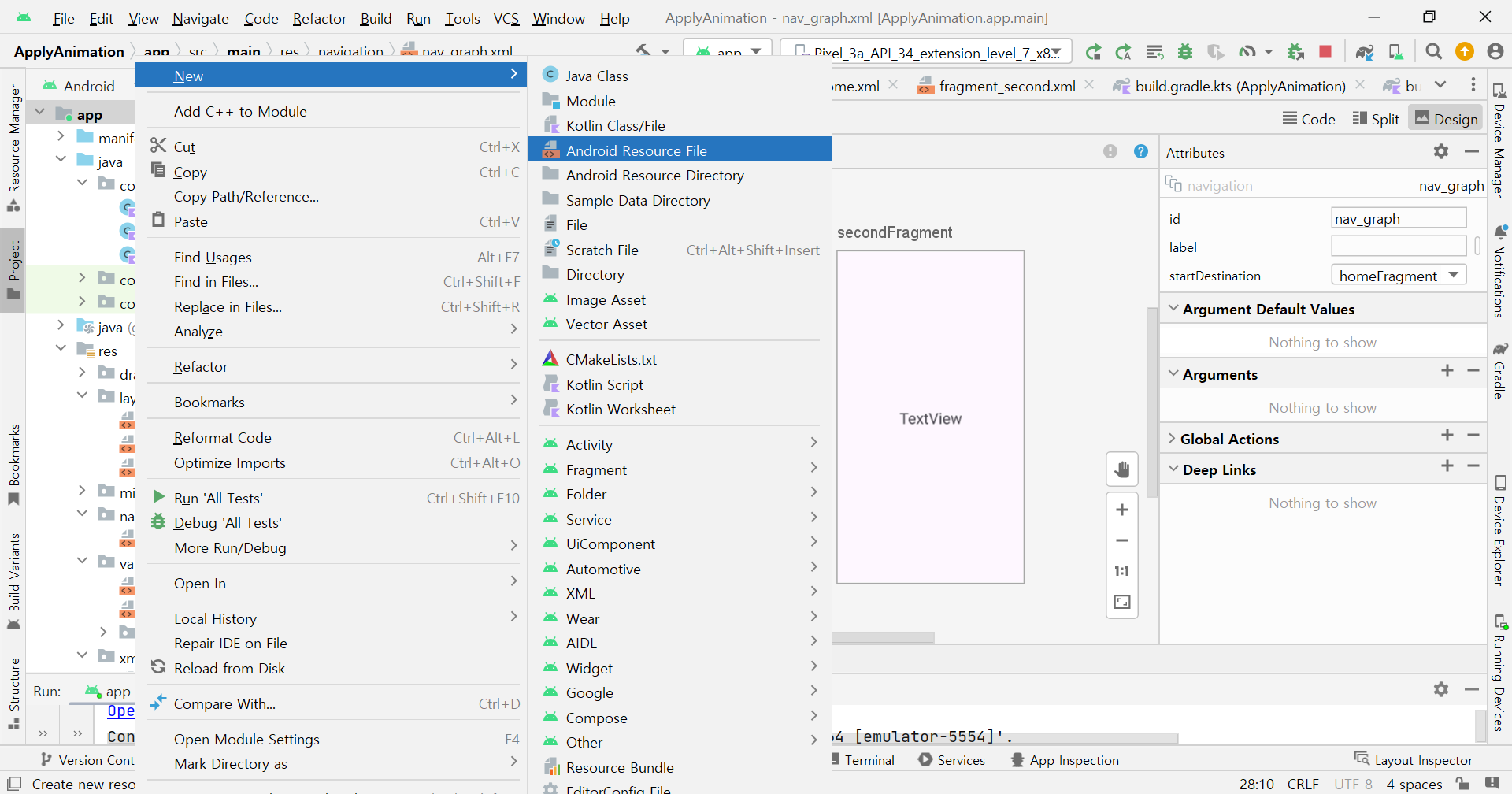 ๋ชจ๋์ ์ด๋ฆ(์ฌ๊ธฐ์๋ "app")์ ์ฐํด๋ฆญํ๋ฉด ๋์ค๋ ๋ฉ๋ด์์ [New] - [Android Resource File]์ ํด๋ฆญํ๋ค.