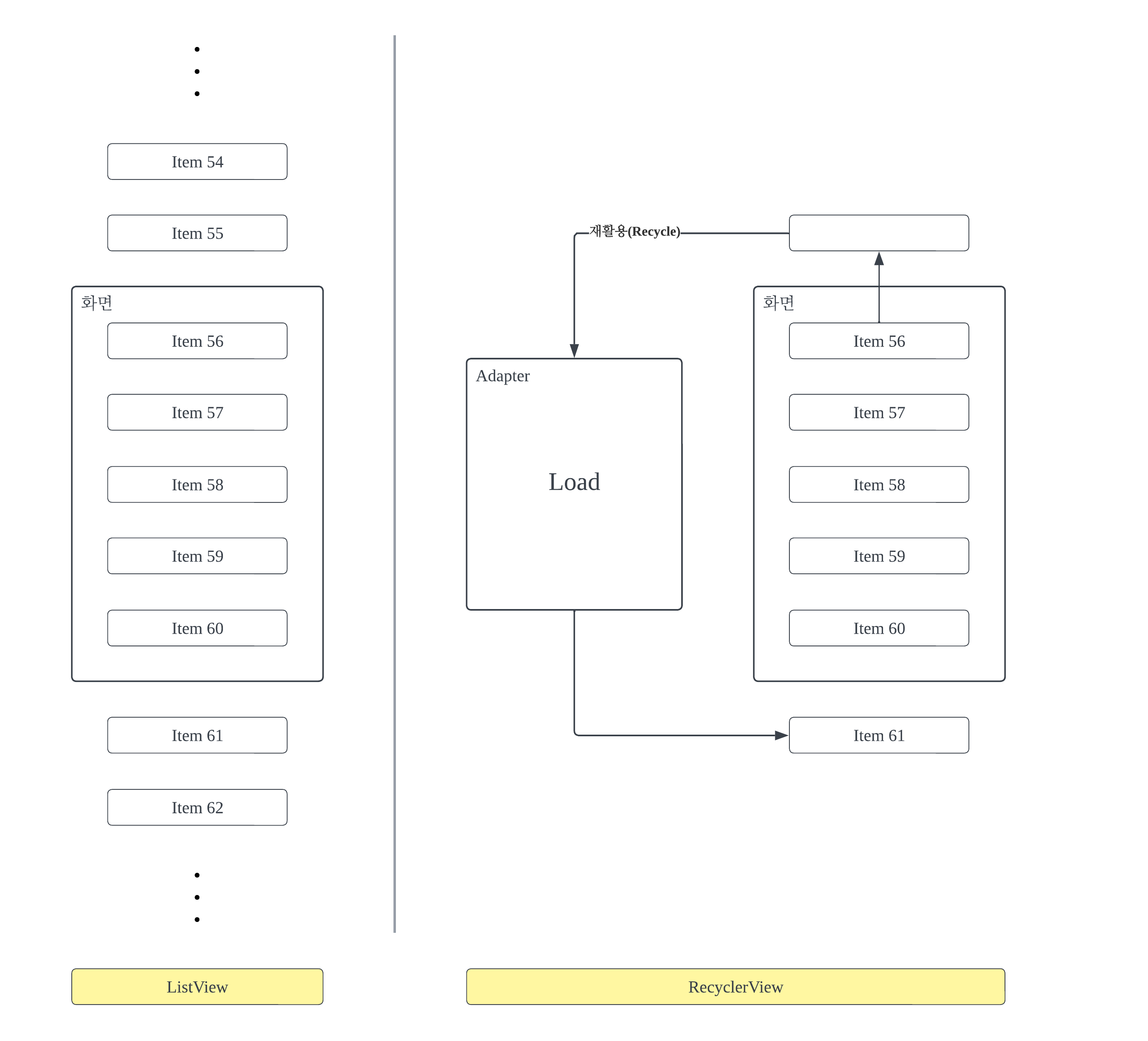 #1 이전 글 [Android] RecyclerView - Adapter에 인자(Argument) 전달#1 이전 글 [Android] RecyclerView - 기초#1 ListView vs RecyclerView 화면에 요소(Item)을 100개 표현한다고 해보자. ListView나 GridView 등의 전통적인 Container Widget들은 이 100개의 아이템을 모두 불러온(load)다. 그kenel.tistory.com이전 게시글에선 Item의 List를 Adapter의 인자로 전달했었다. 이 때, 위 게시글의 완성된 앱을 수정해서 Item의 List가 여러 번 바뀌는 경우를 생각해보겠다. #2 Item의 List의 빈번한 변경#2-1 개요위와 같이 맨 위의 버튼을 누르면, RecyclerVi..